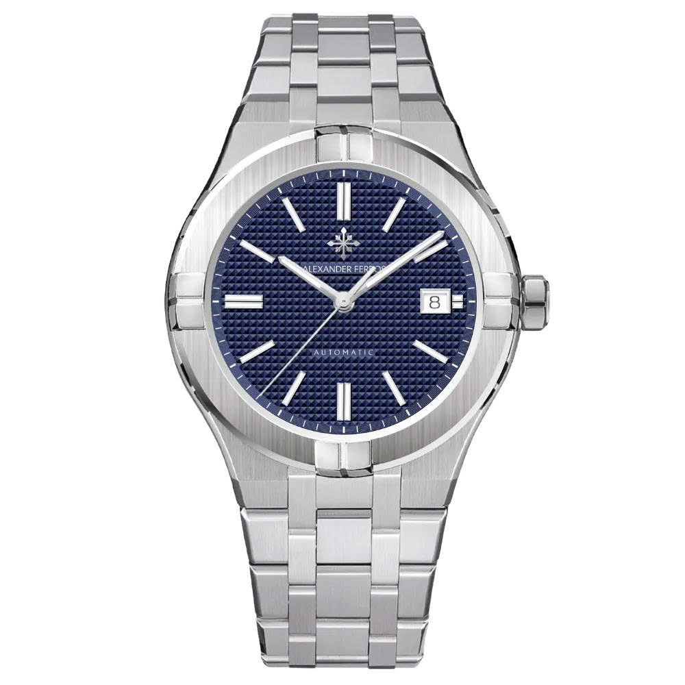 Alexander Ferros 3062 là mẫu đồng hồ nam tự động nổi bật với phong cách thể thao lịch lãm và thiết kế hiện đại. Mặt số xanh navy mạnh mẽ được trang trí bằng họa tiết vân caro độc đáo, kết hợp cùng bộ kim và cọc số dạng vạch phủ dạ quang, giúp dễ dàng quan sát giờ trong điều kiện thiếu sáng.