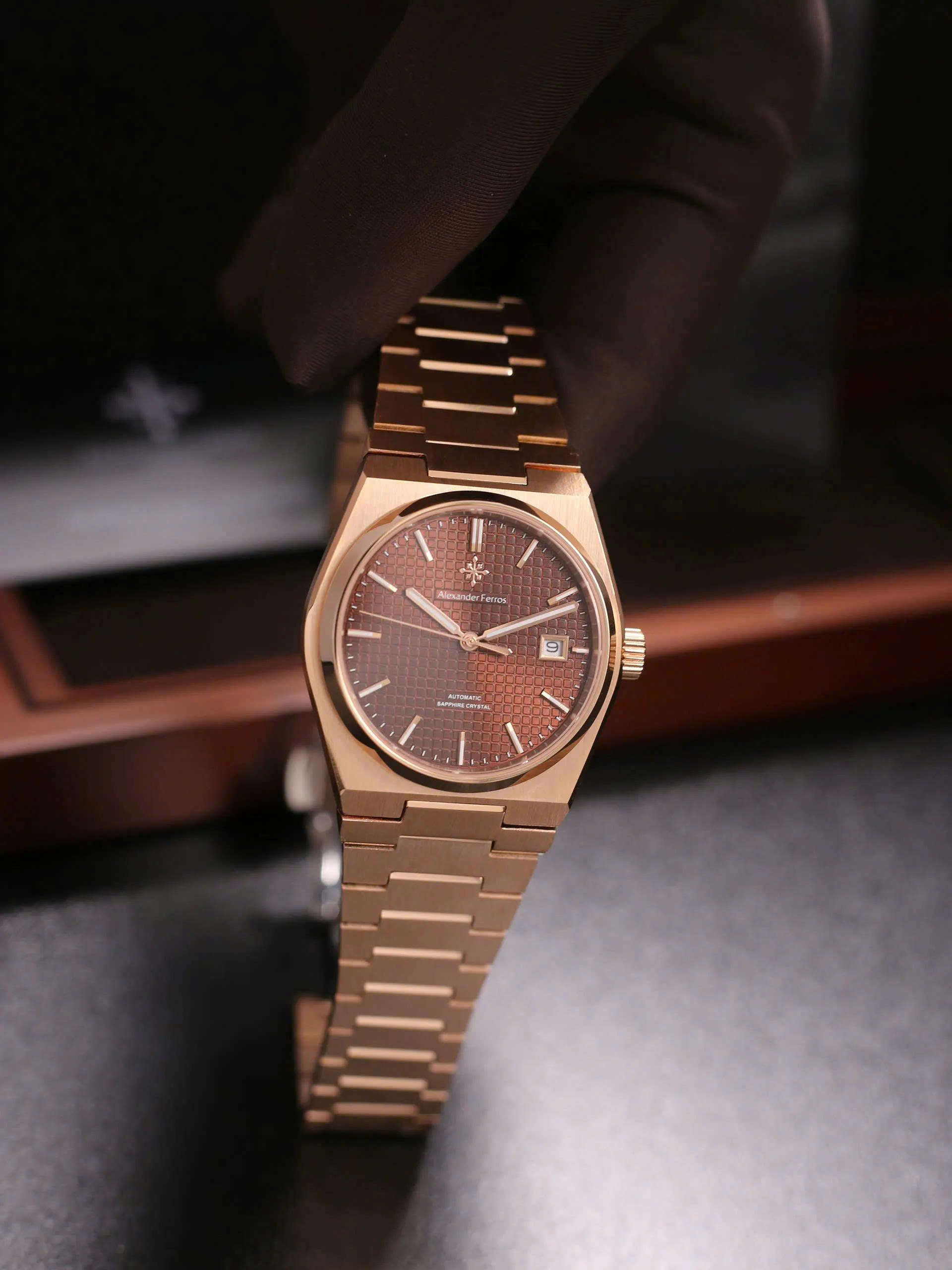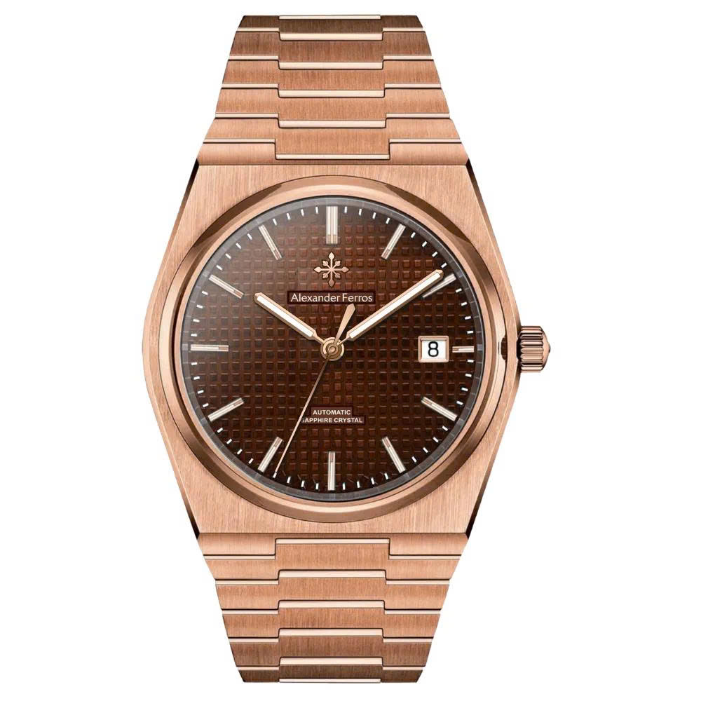 Alexander Ferros 5052 nổi bật với thiết kế tinh xảo, kết hợp giữa phong cách cổ điển và hiện đại. Vỏ đồng hồ được chế tác từ thép không gỉ cao cấp, chống trầy xước, bền bỉ với thời gian. Mặt kính sapphire trong suốt, chống lóa, bảo vệ cơ chế bên trong.
