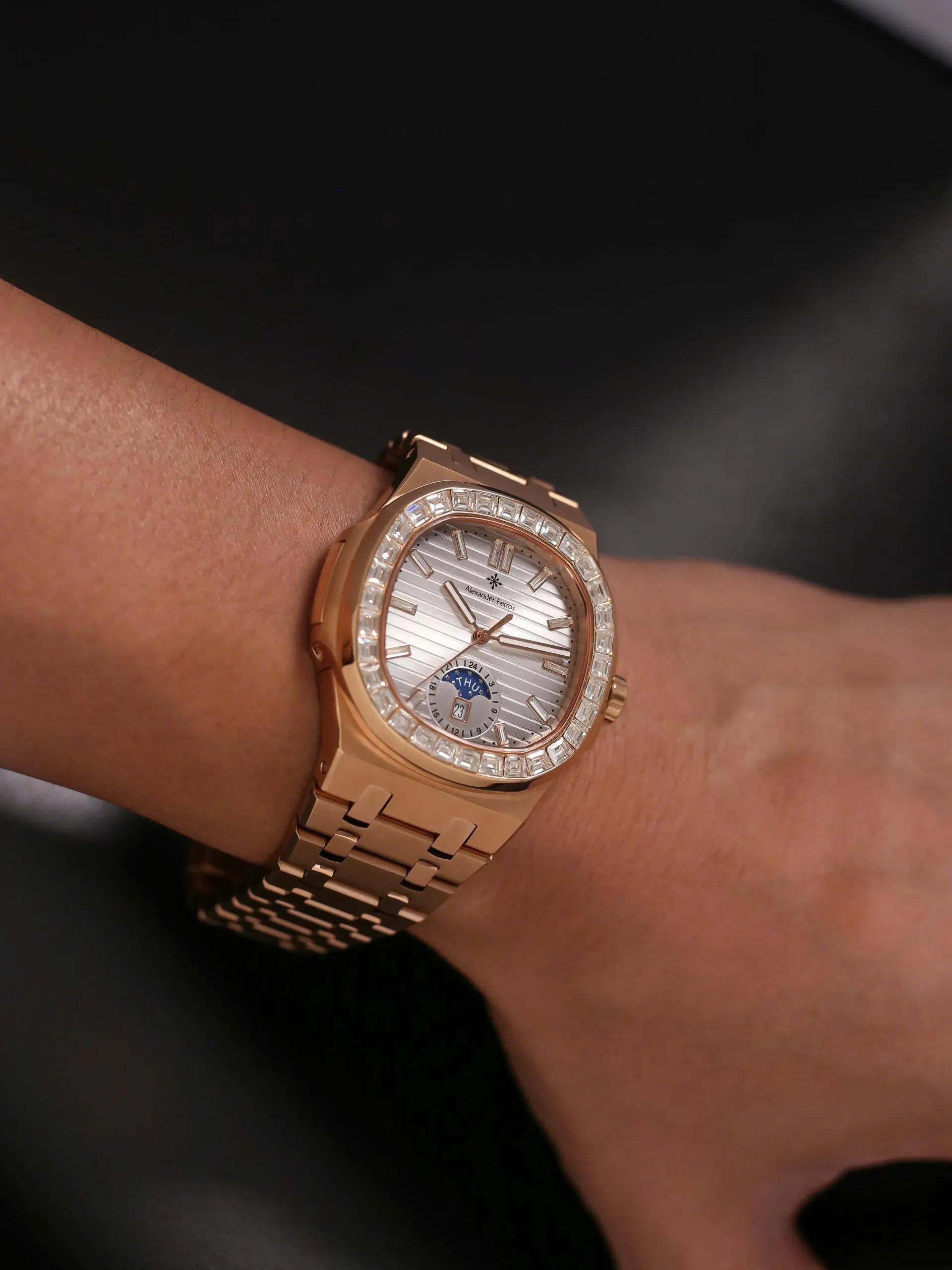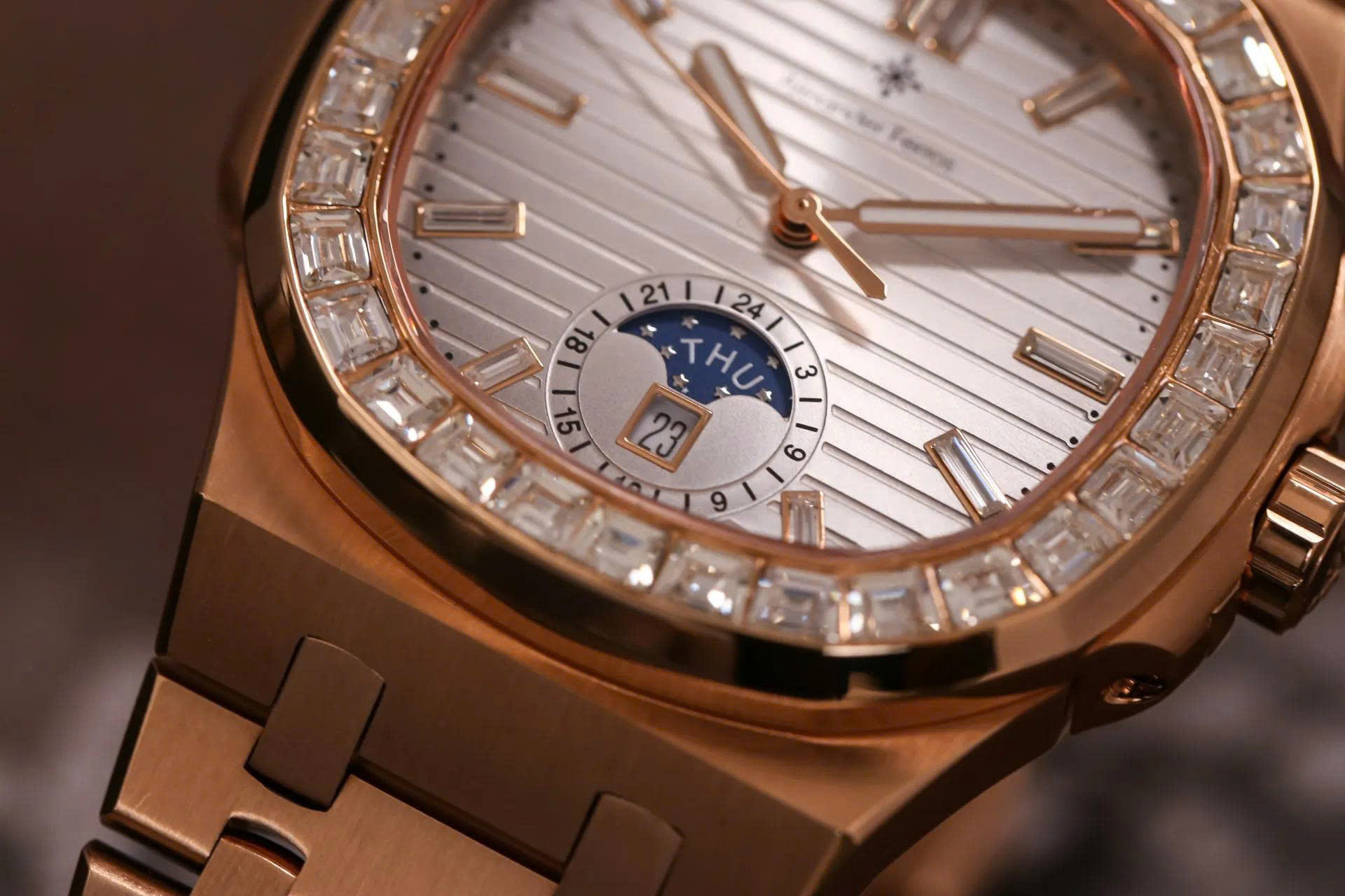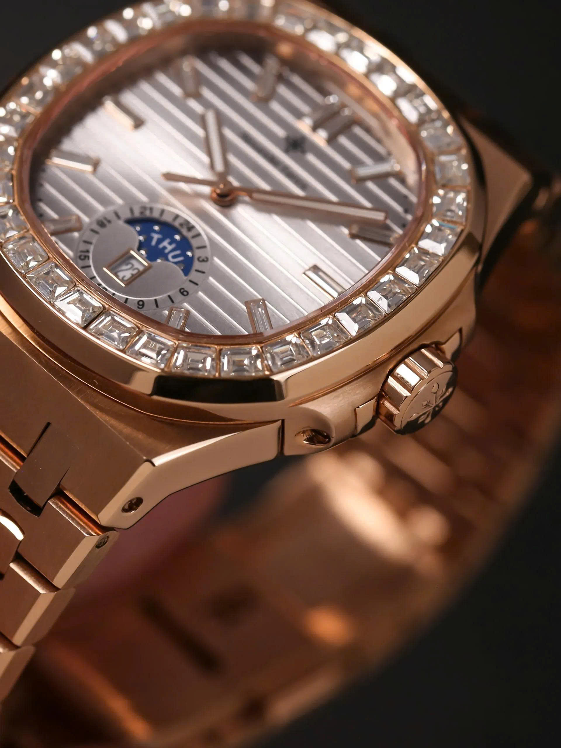 Mỗi mẫu đều được đính đá quanh viền, tạo nên vẻ đẹp lấp lánh, thu hút mọi ánh nhìn. Đặc biệt, mặt đồng hồ 3D khắc họa chuyển động lịch tuần trăng độc đáo, không chỉ tăng tính thẩm mỹ mà còn thể hiện đẳng cấp người đeo.