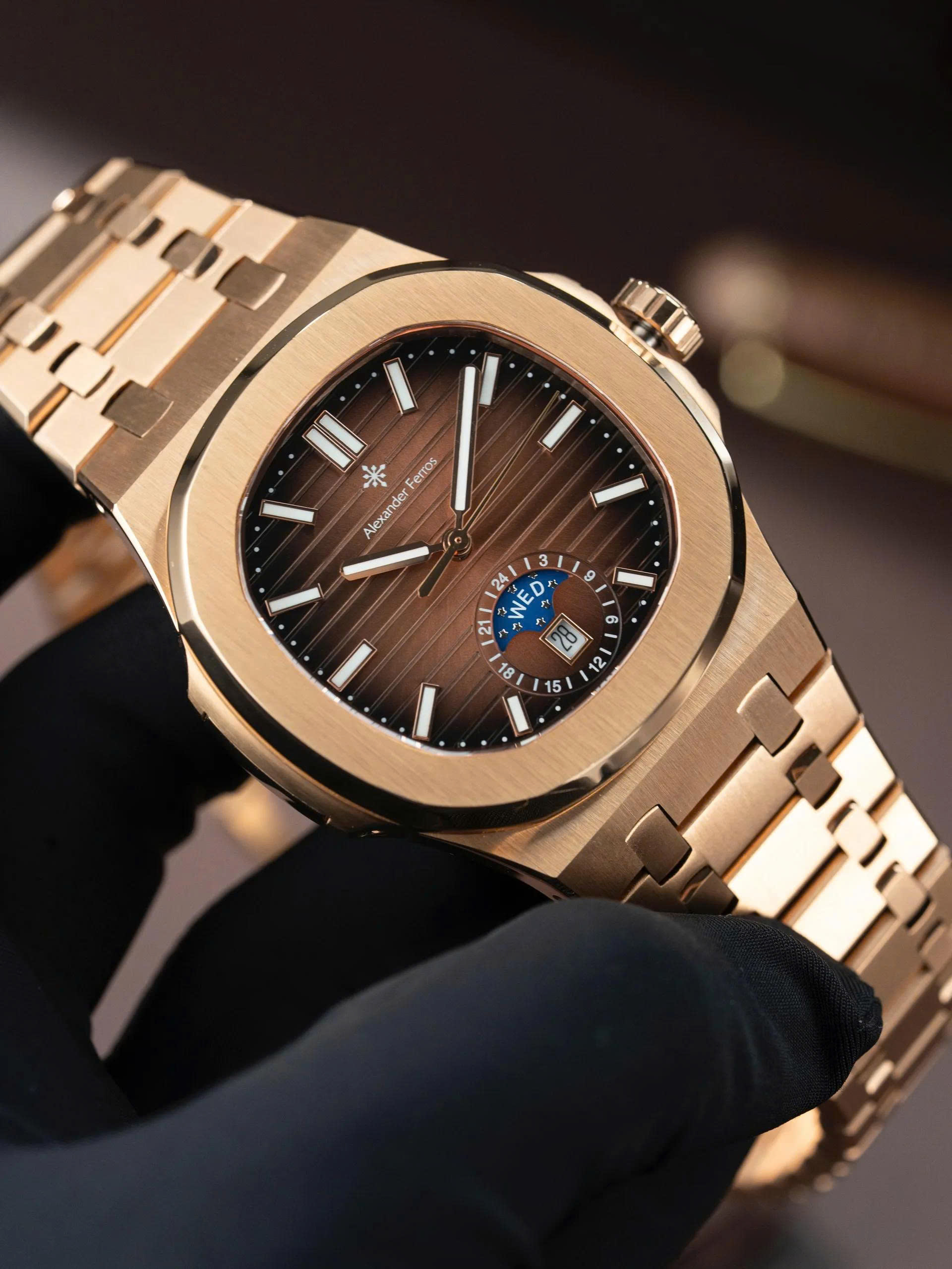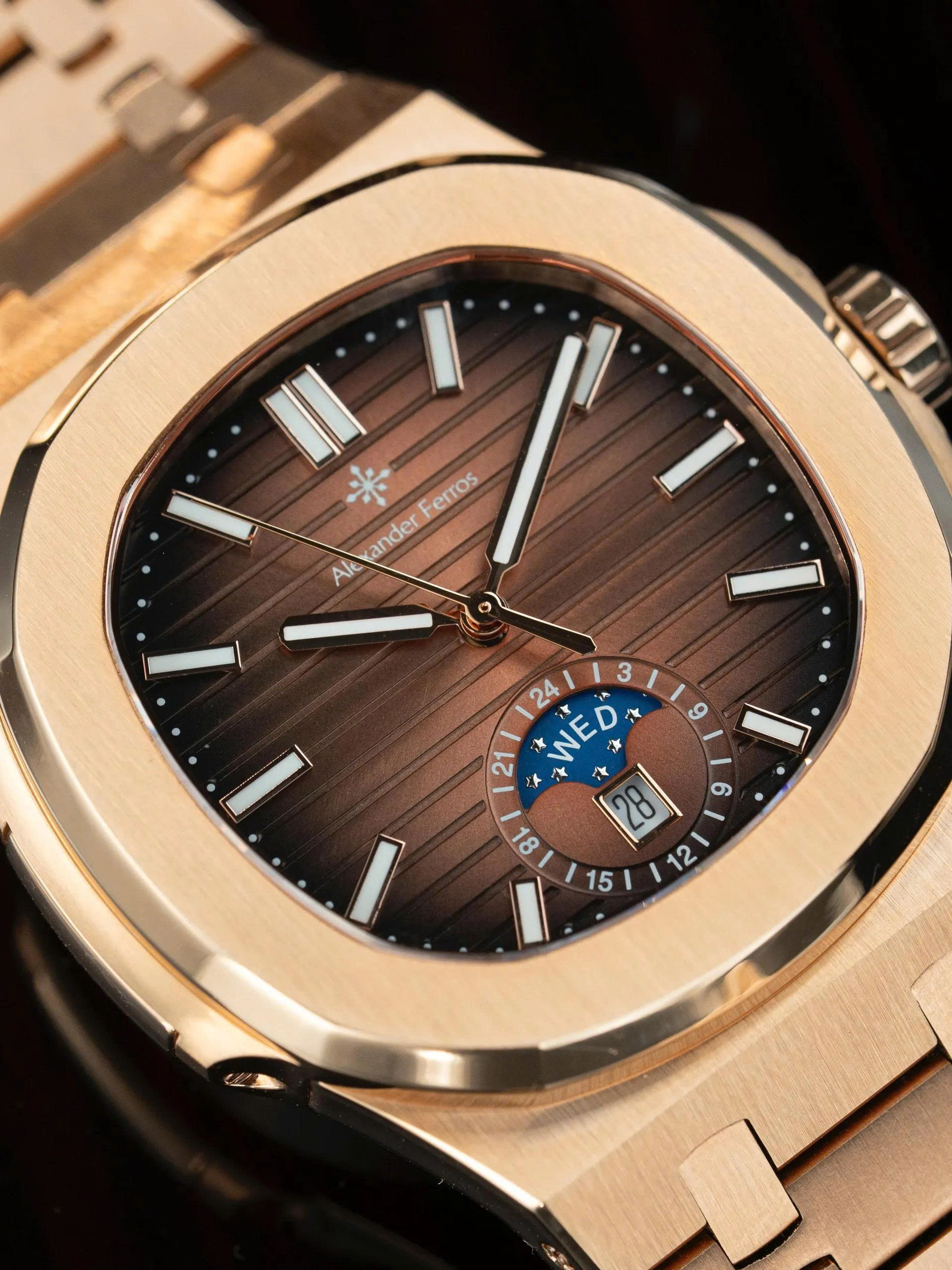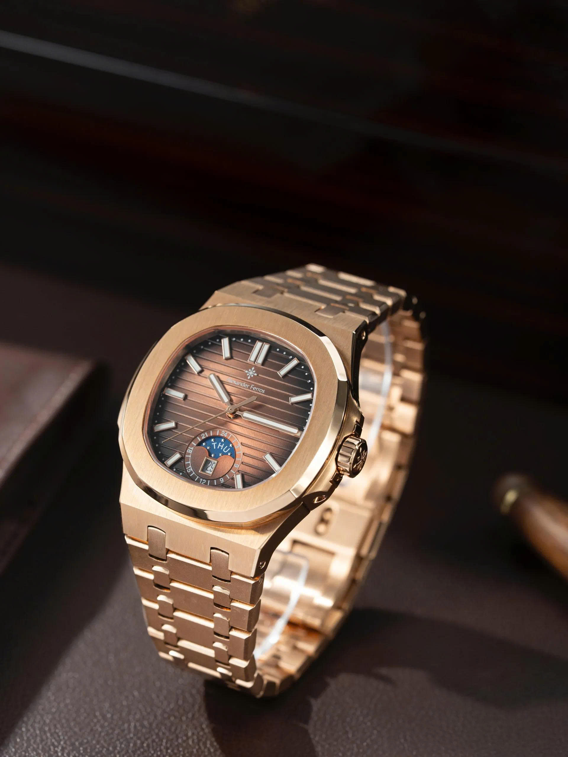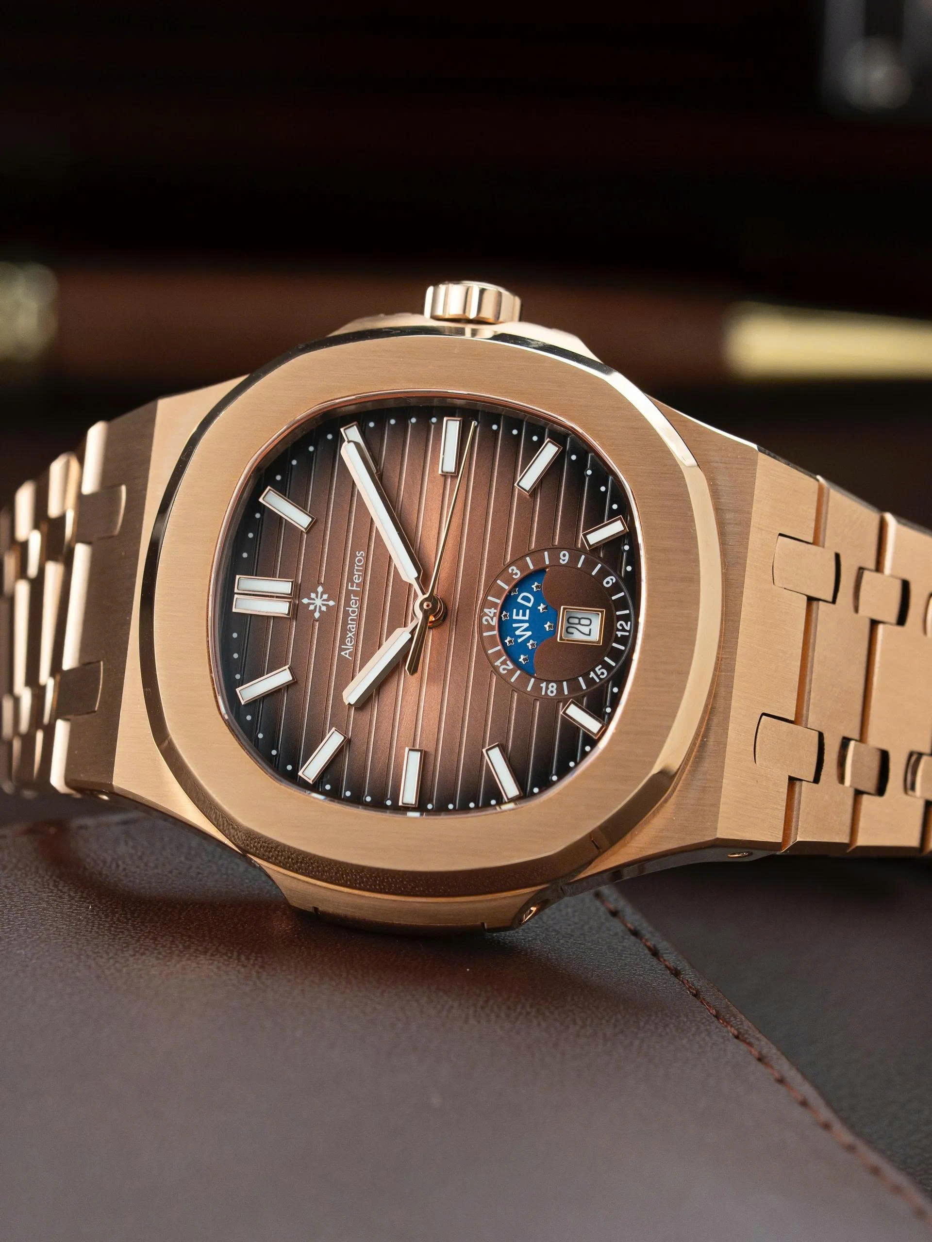 Cả hai đều kết hợp hoàn hảo với mặt số nâu gỗ ánh kim đầy chiều sâu. Thiết kế nổi bật với mặt đồng hồ có hiệu ứng ánh sáng chuyển sắc, kèm theo lịch thứ, ngày và lịch tuần trăng bố trí tinh tế tại góc 6 giờ, tạo điểm nhấn đẳng cấp.