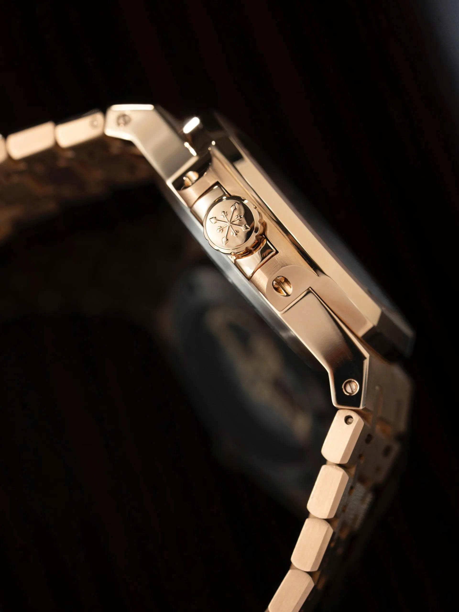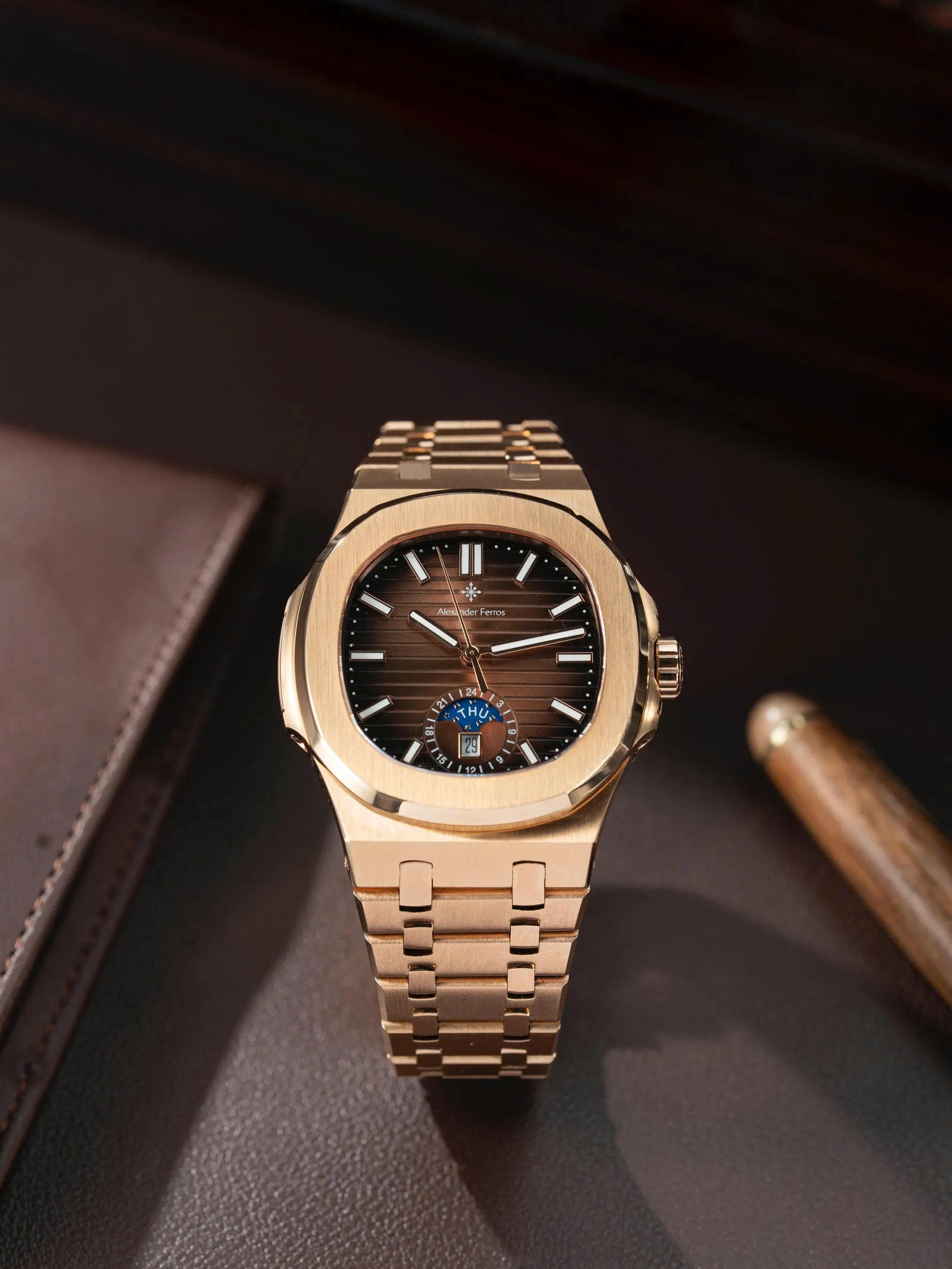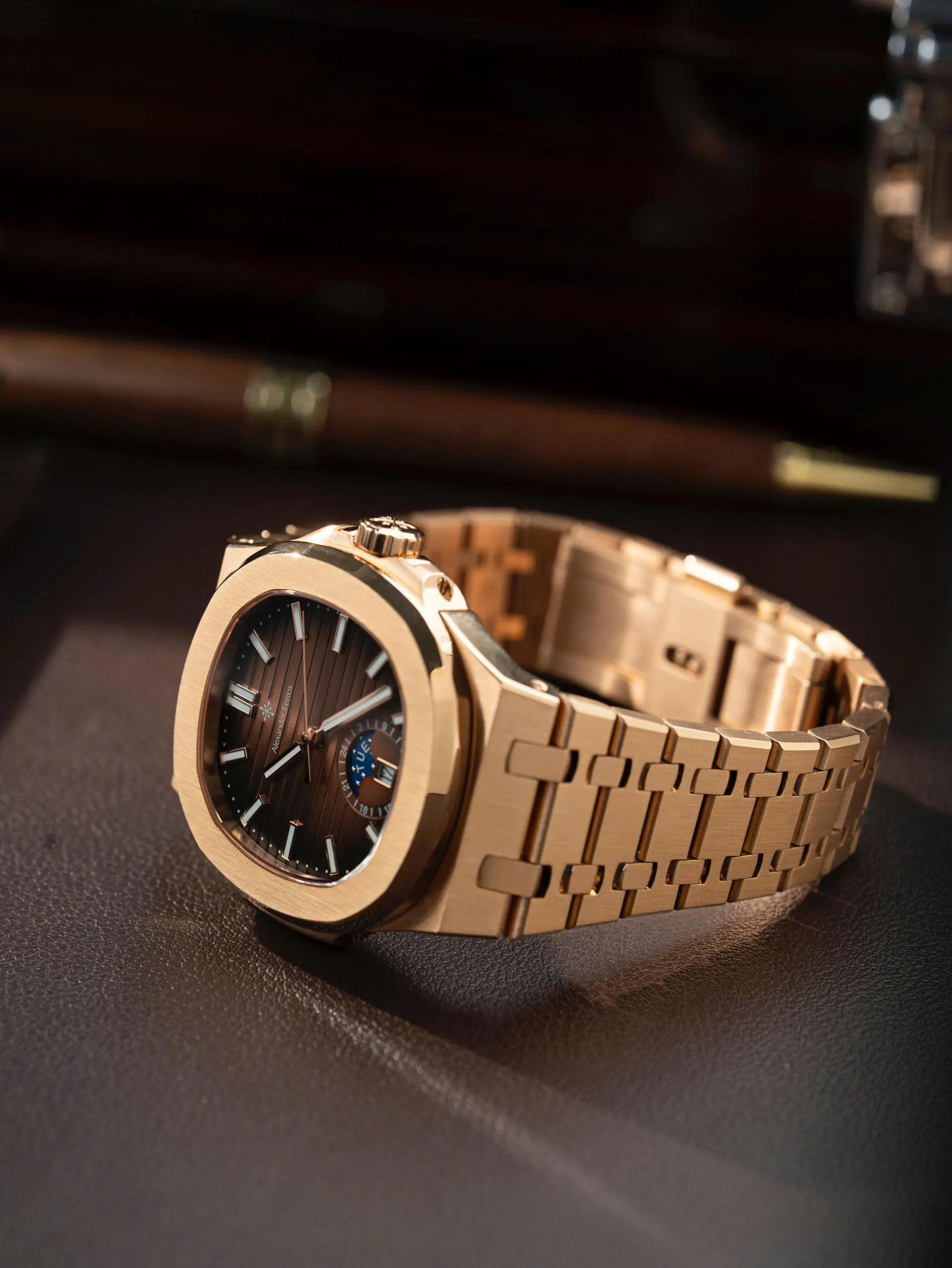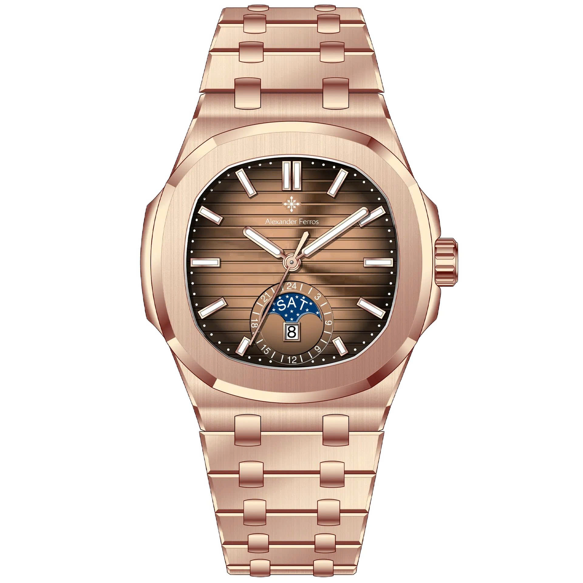 Cả hai đều kết hợp hoàn hảo với mặt số nâu gỗ ánh kim đầy chiều sâu. Thiết kế nổi bật với mặt đồng hồ có hiệu ứng ánh sáng chuyển sắc, kèm theo lịch thứ, ngày và lịch tuần trăng bố trí tinh tế tại góc 6 giờ, tạo điểm nhấn đẳng cấp.