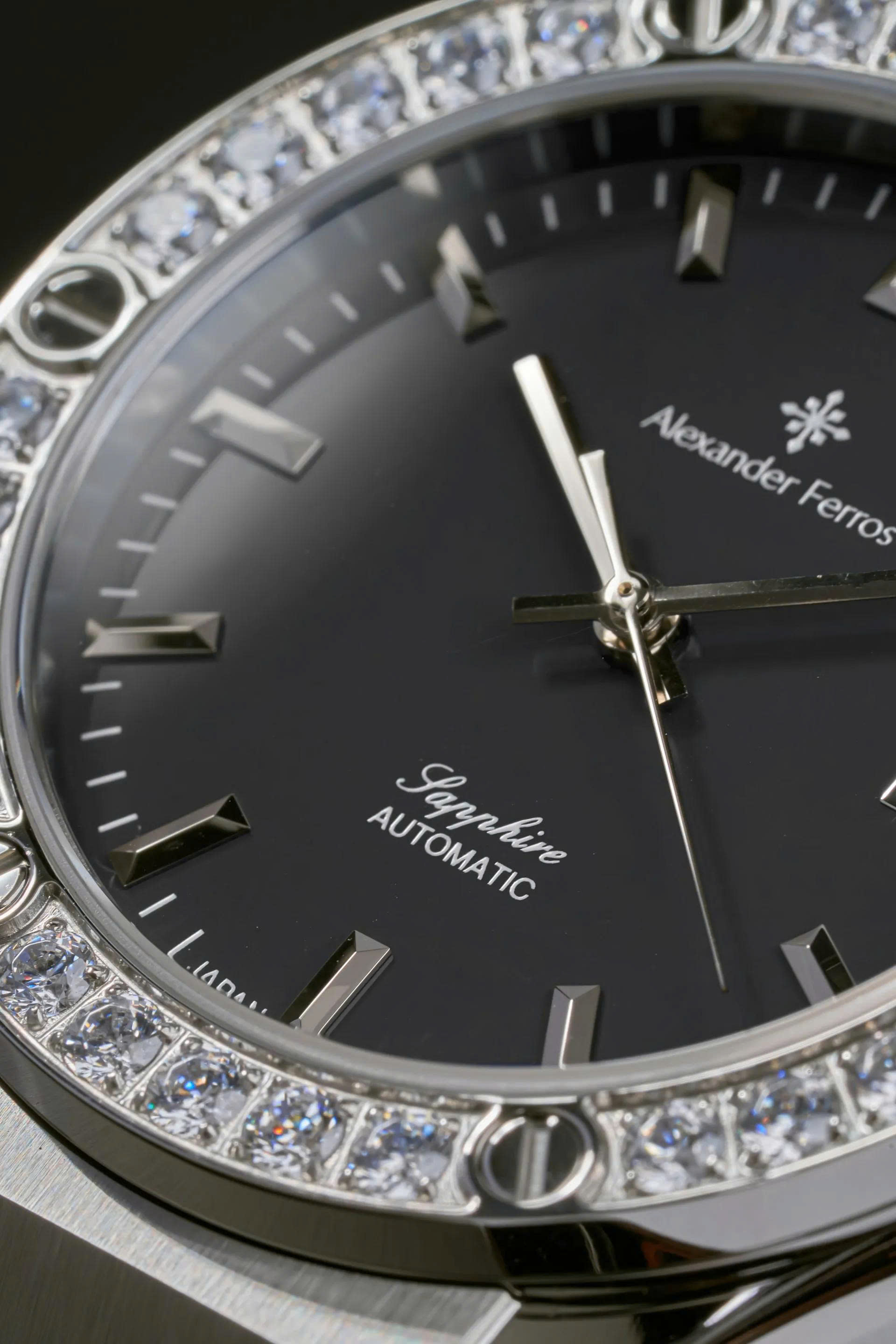 Vỏ thép không gỉ bạc khỏe khoắn, nhiều tùy chọn mặt số (đen, trắng, xanh, đỏ), đi kèm viền đá sang trọng cho vẻ ngoài cuốn hút.
