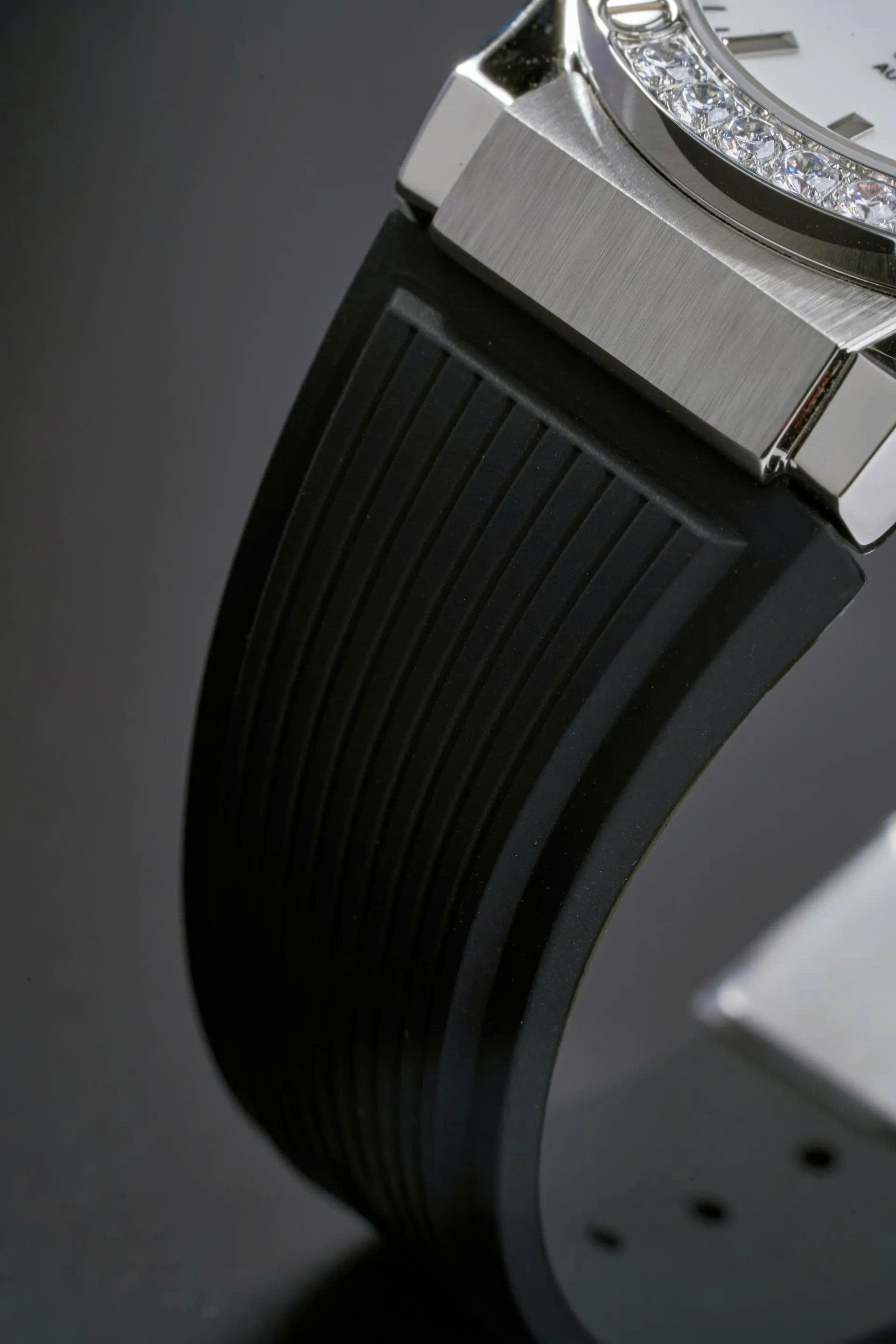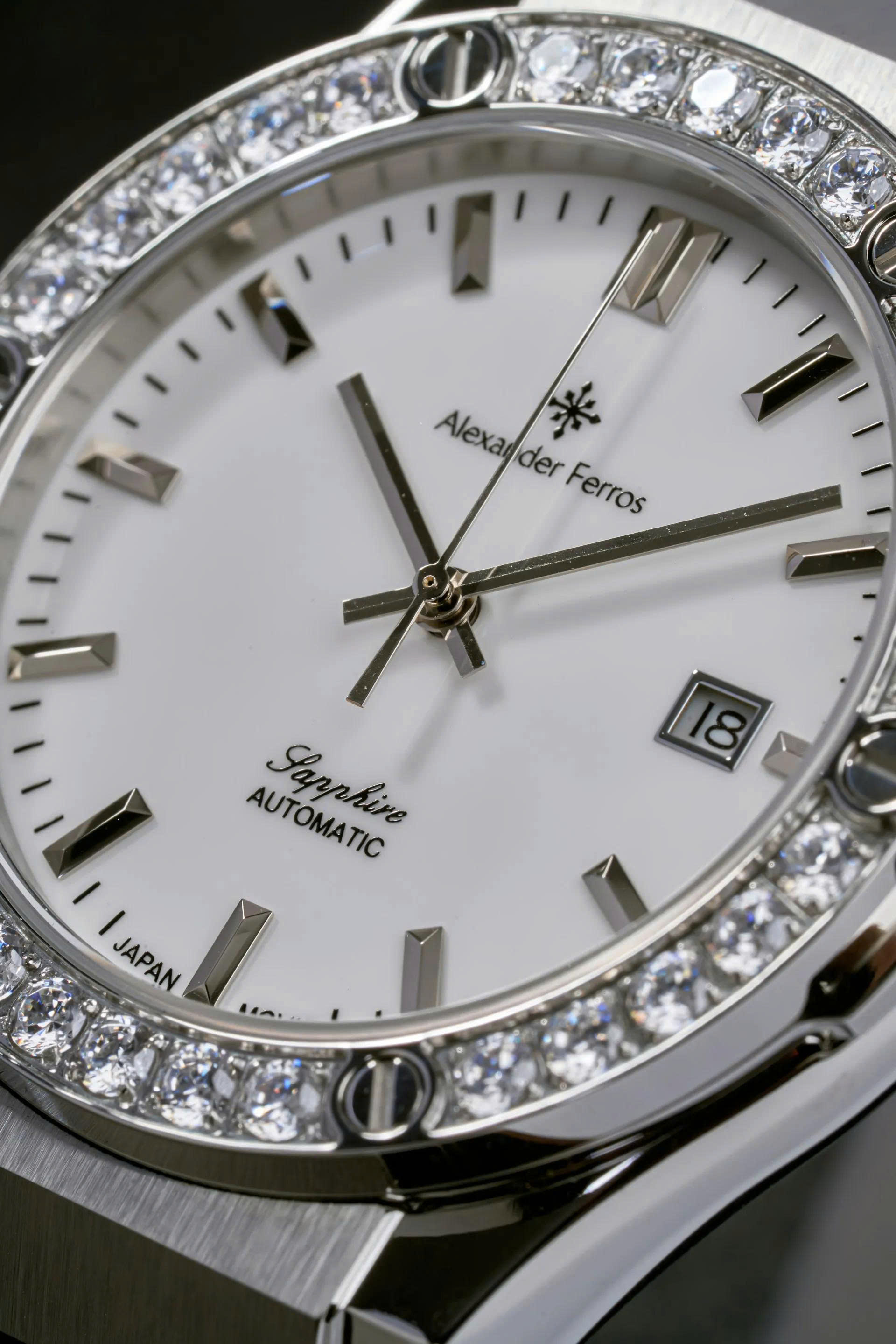 Vỏ thép không gỉ bạc khỏe khoắn, nhiều tùy chọn mặt số (đen, trắng, xanh, đỏ), đi kèm viền đá sang trọng cho vẻ ngoài cuốn hút.