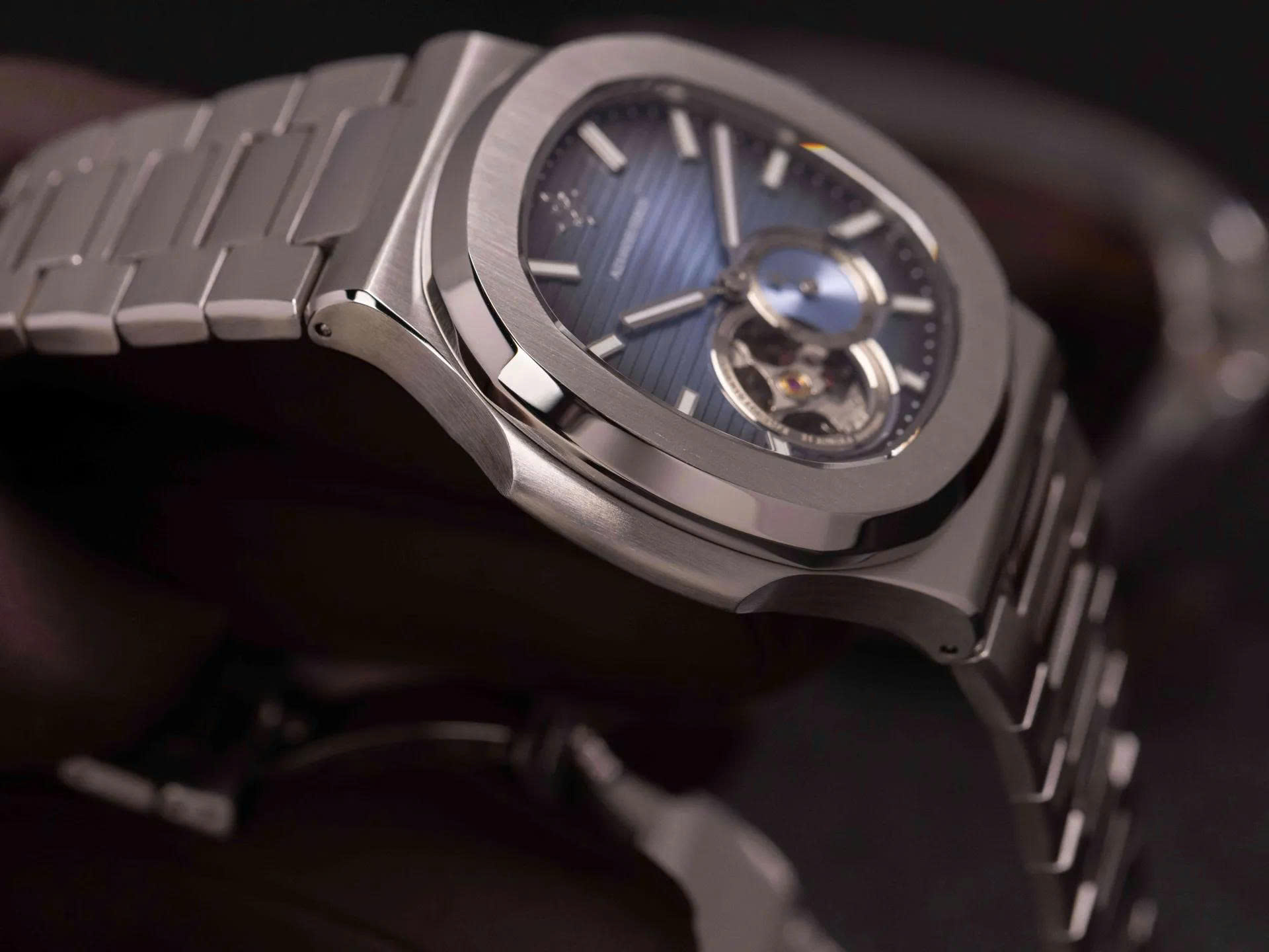 Nổi bật là cửa sổ open-heart góc 6h để lộ chuyển động cơ học tinh xảo cùng mặt phụ, cho thấy sự chỉn chu trong từng chi tiết. Cọc số và kim được chế tác sắc nét, phủ dạ quang giúp dễ dàng quan sát trong điều kiện thiếu sáng.