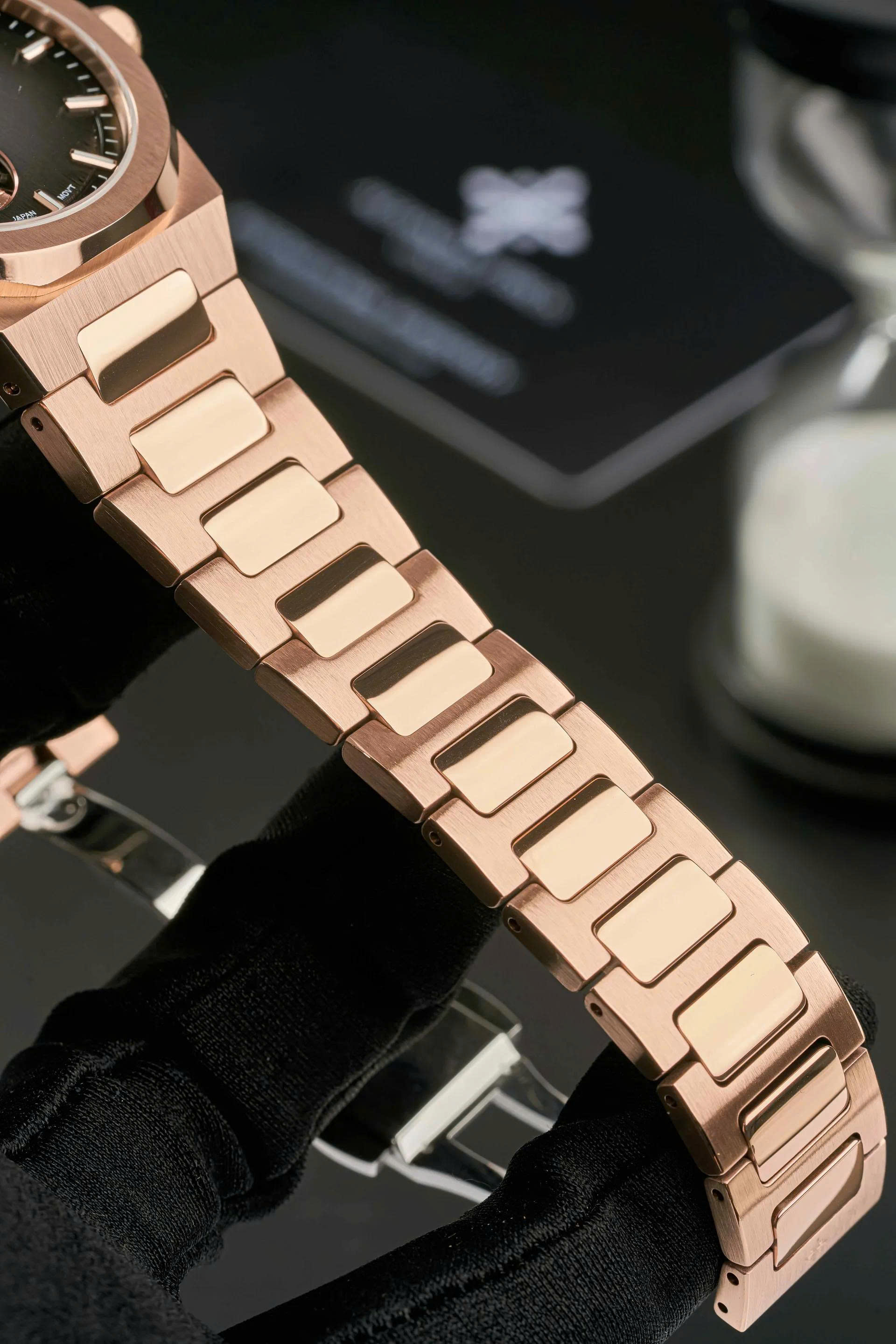 Vỏ được chế tác từ thép không gỉ cao cấp, mang đến sự bền bỉ và cảm giác chắc chắn khi đeo. Viền bezel cách điệu với các đường cắt góc cạnh, tăng thêm vẻ nam tính và năng động.