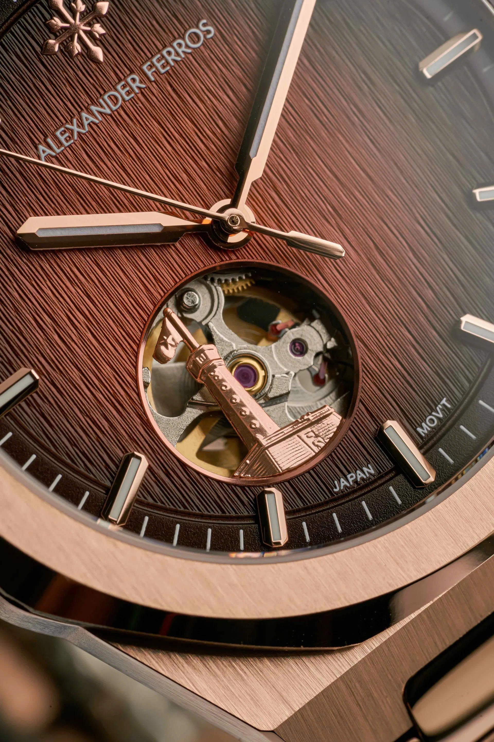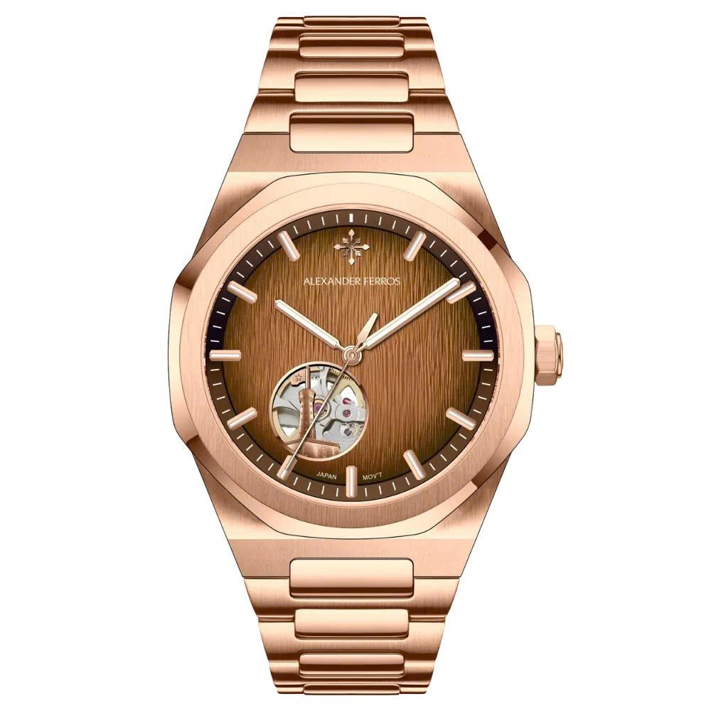 Alexander Ferros 9292 là mẫu đồng hồ nam nổi bật với phong cách thể thao lịch lãm và thiết kế hiện đại. Mặt số với nhiều phiên bản màu được trang trí bằng họa tiết vân gỗ độc đáo, kết hợp cùng bộ kim và cọc số dạng vạch phủ dạ quang, giúp dễ dàng quan sát giờ trong điều kiện thiếu sáng. Điểm đặc biệt của mẫu này là thiết kế Open heart góc 7h kết hợp với hình ảnh Cột cờ Dinh Độc Lập mang bản sắc riêng.