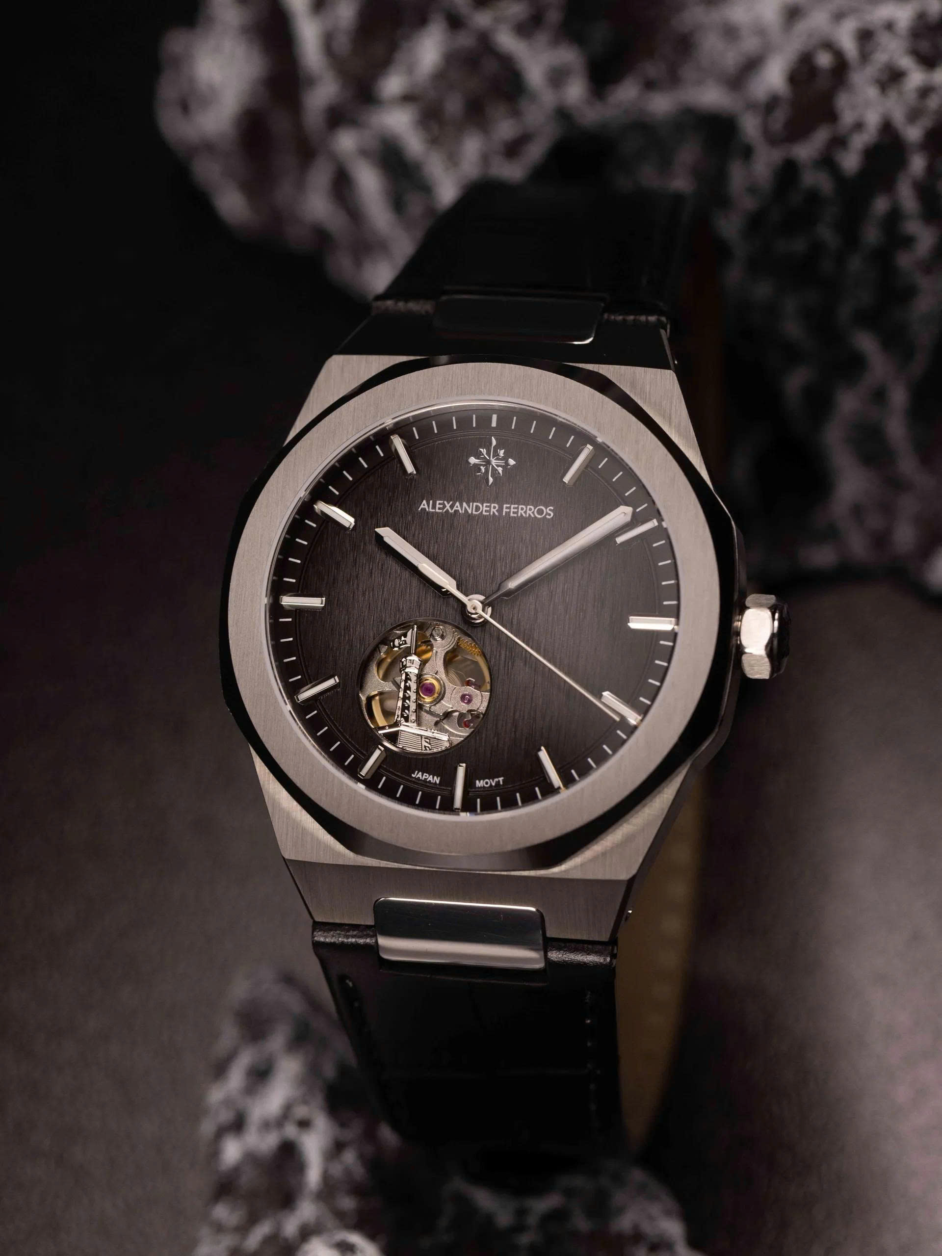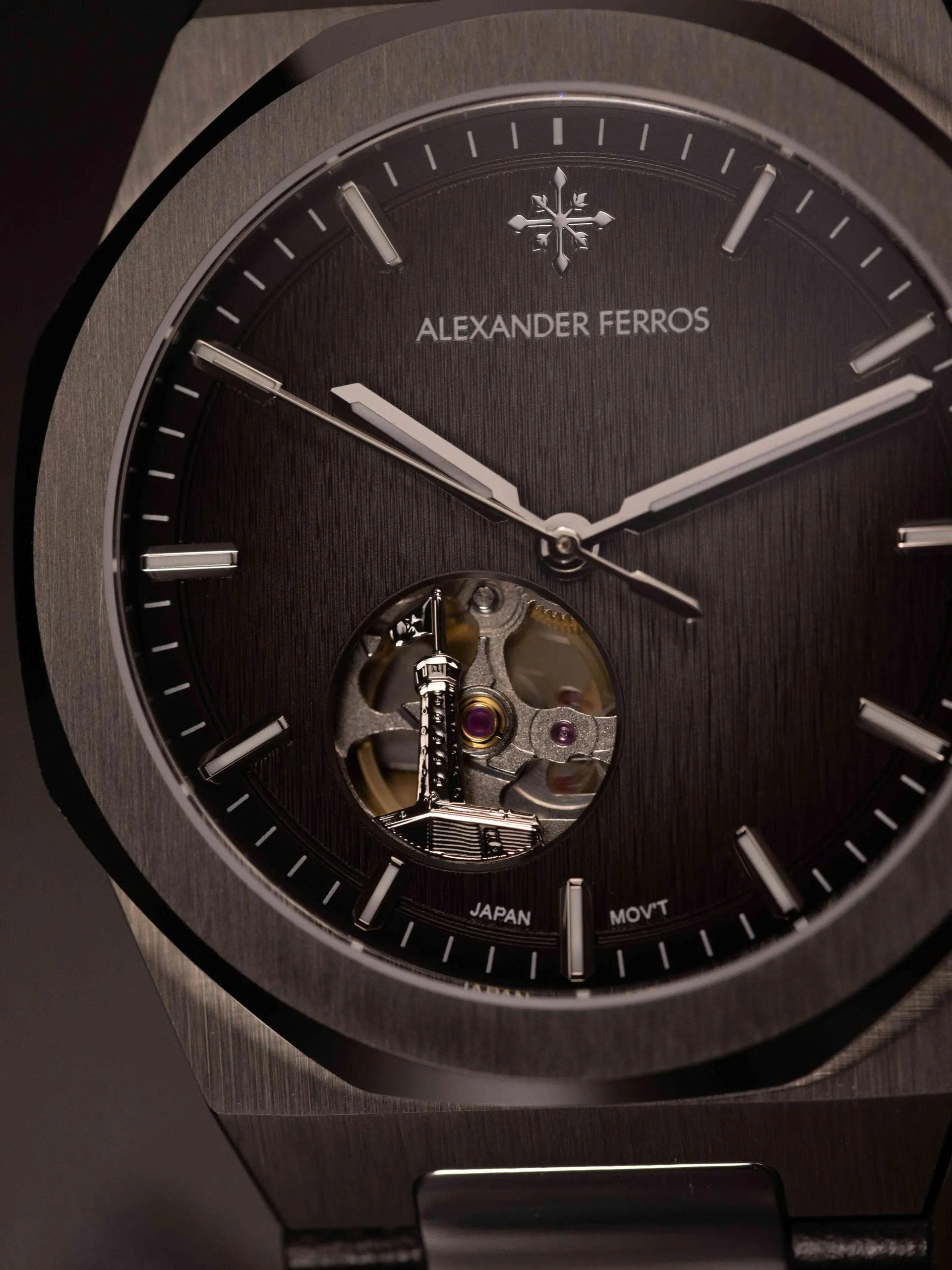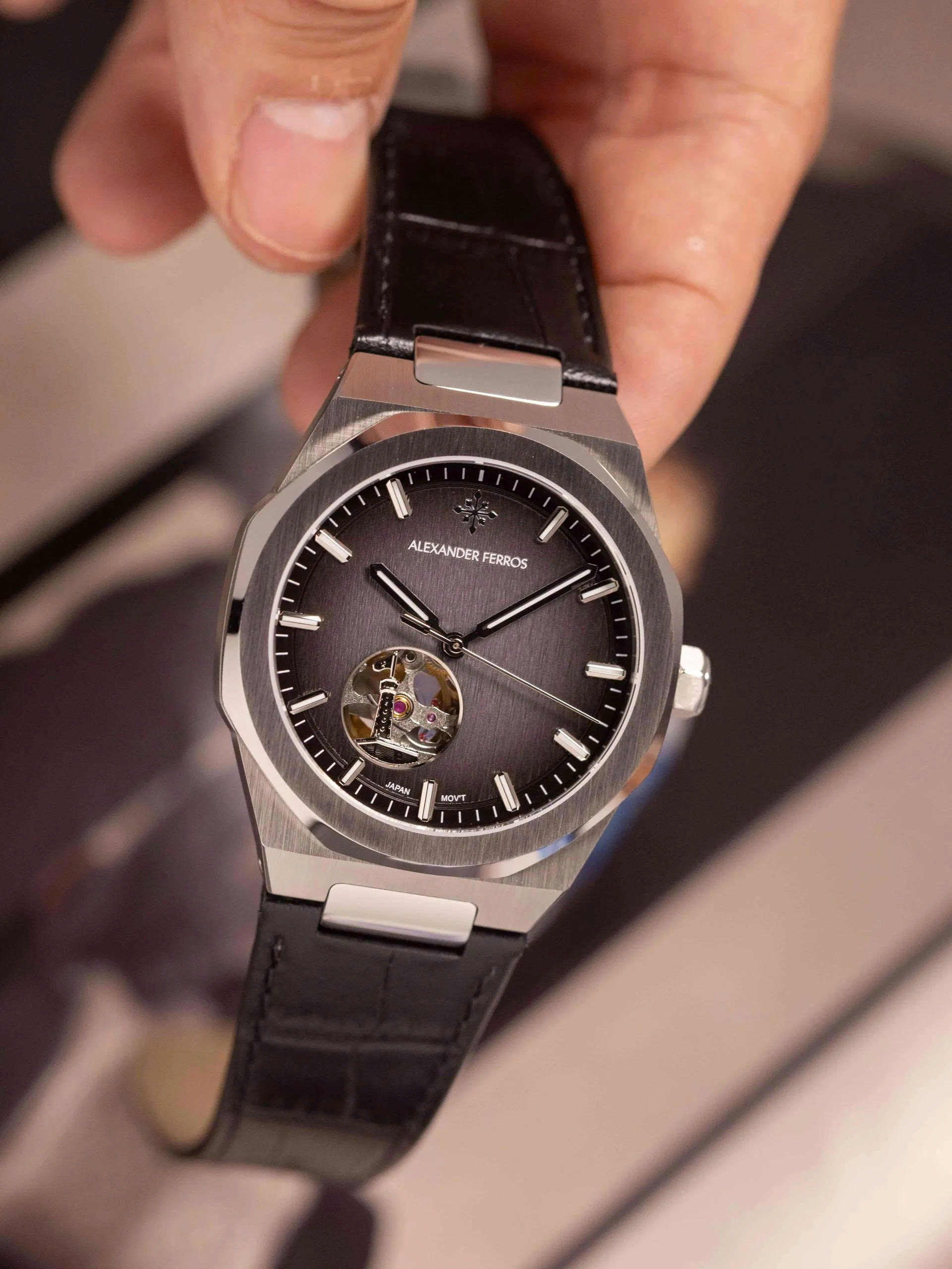 Alexander Ferros 9292 là mẫu đồng hồ nam nổi bật với phong cách thể thao lịch lãm và thiết kế hiện đại. Mặt số với nhiều phiên bản màu được trang trí bằng họa tiết vân gỗ độc đáo, kết hợp cùng bộ kim và cọc số dạng vạch phủ dạ quang, giúp dễ dàng quan sát giờ trong điều kiện thiếu sáng. Điểm đặc biệt của mẫu này là thiết kế Open heart góc 7h kết hợp với hình ảnh Cột cờ Dinh Độc Lập mang bản sắc riêng.