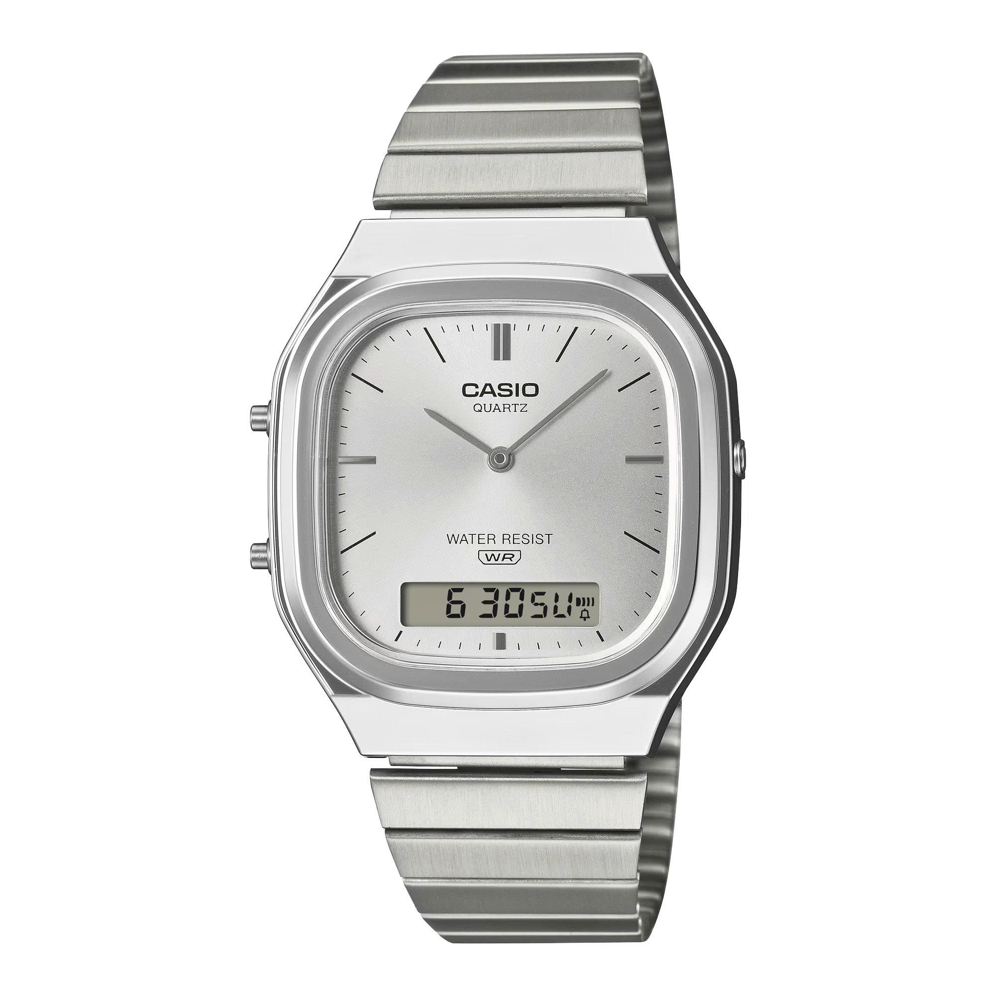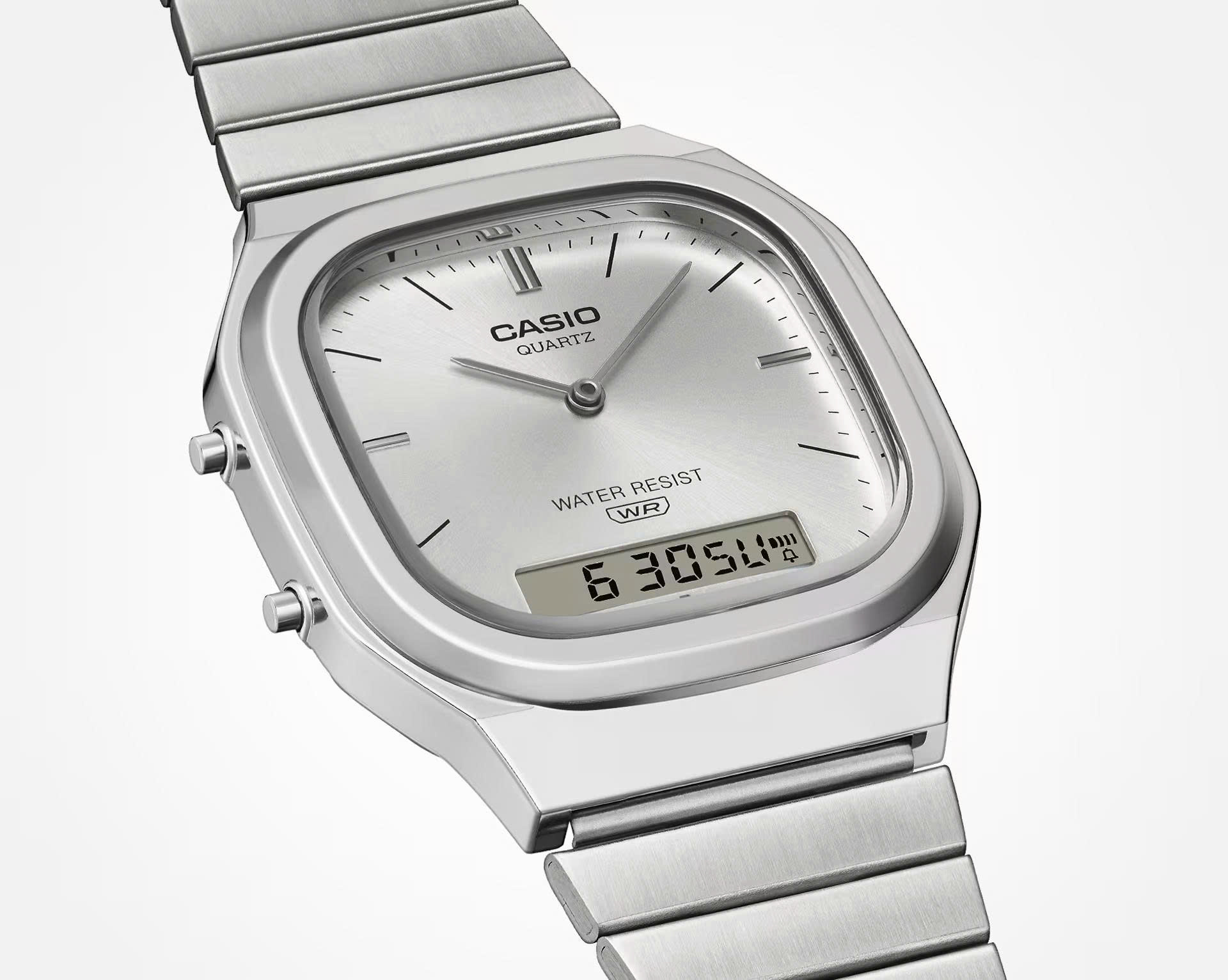 Hãy thổi hồn hiện đại vào phong cách retro của bạn, hoặc điểm xuyết nét cổ điển cho phong cách đương đại của bạn. Dù bạn chọn phong cách nào, chiếc AQ-240E tinh tế và uyển chuyển đều sẽ là lựa chọn hoàn hảo. Chiếc AQ-240 kim-số với màn hình kép mang phong cách cổ điển pha lẫn hiện đại. Với mặt đồng hồ hơi vuông vức, vỏ máy bo tròn nhẹ nhàng và những đường cong kim loại mềm mại, chiếc đồng hồ này toát lên vẻ tinh tế. Lớp hoàn thiện theo thiết kế tia nắng trên mặt số bắt sáng rực rỡ. Các vạch chỉ giờ kim loại kết hợp giữa nét cổ điển và vẻ đẹp hiện đại, tạo thêm điểm nhấn bắt mắt. Màn hình LCD kỹ thuật số ở vị trí 6 giờ mang lại khả năng hiển thị vượt trội, đồng thời vẫn giữ được thiết kế tổng thể hài hòa, tạo nên một chiếc đồng hồ vừa tiện dụng vừa đẹp mắt.