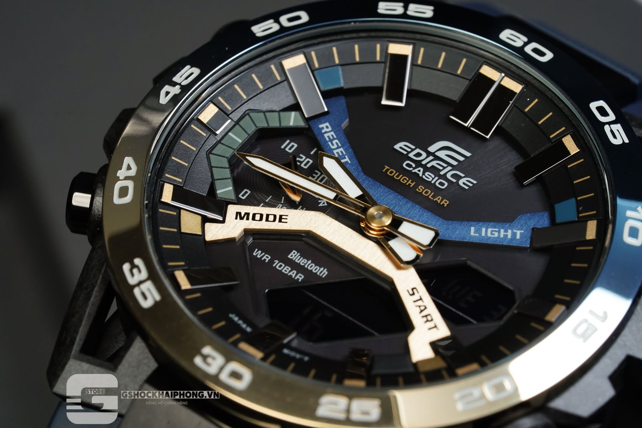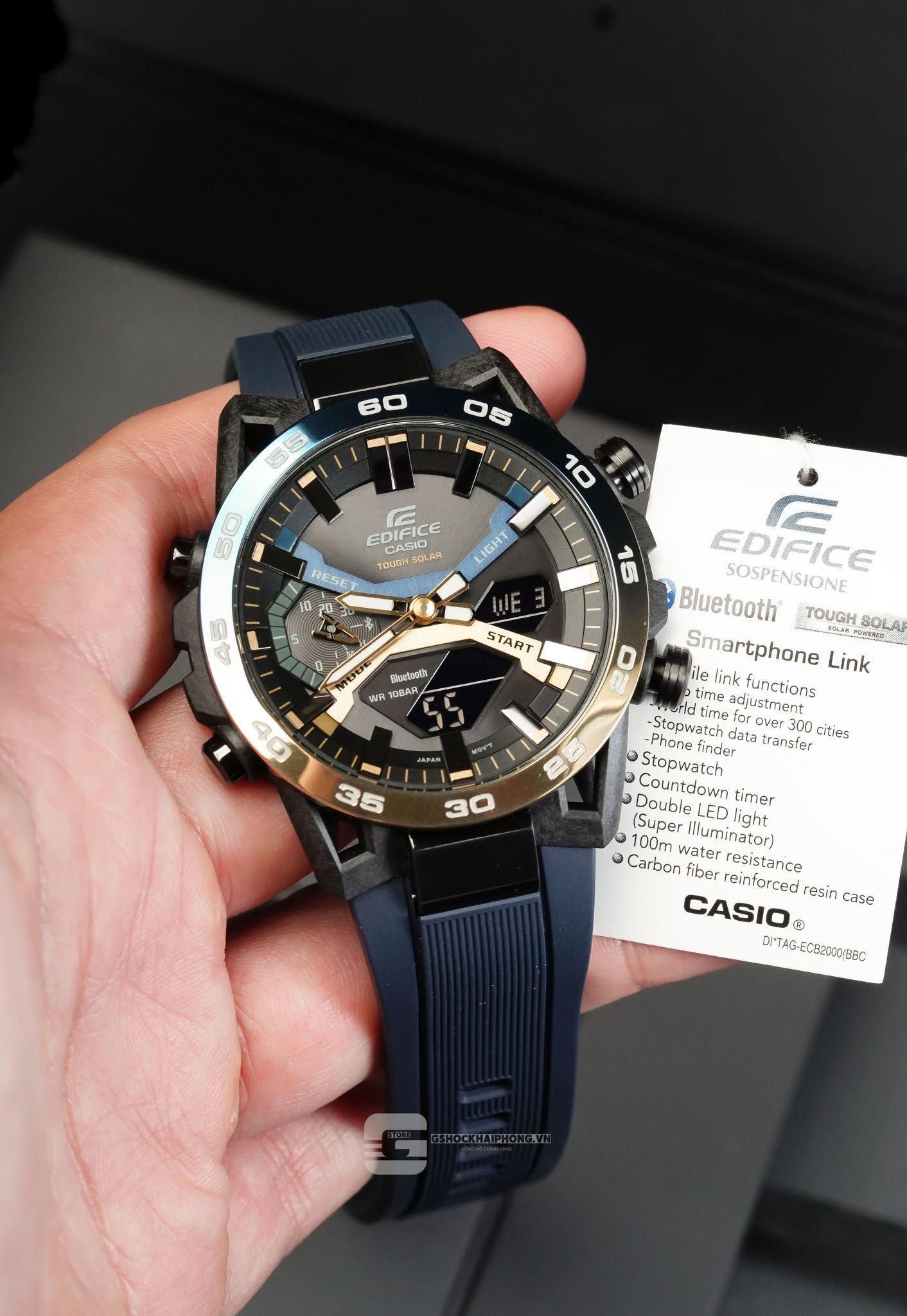 Bạn yêu thích cảm giác lái xe trên những con đường tối? Ánh sáng rực rỡ của đèn pha và đèn đường xuyên qua màu xanh thẳm của bầu trời đêm? Vậy thì bạn sẽ thích chiếc đồng hồ EDIFICE được thiết kế để nắm bắt cảm giác lái xe vào ban đêm, được thiết kế phù hợp cho những người đam mê ô tô. Cảm giác hào hứng khi lái xe trên đường phố vào ban đêm được thể hiện bằng hiệu ứng chuyển màu rực rỡ trên đường gờ — bầu trời đêm được tái tạo bằng lớp mạ ion màu xanh dương đậm chuyển dần sang màu vàng gợi nhớ đến ánh đèn đô thị vào buổi tối. Hiệu ứng chuyển màu giữa hai màu này lần đầu tiên xuất hiện trên EDIFICE, tạo nên một đường gờ tuyệt đẹp với độ sáng bóng tinh tế cũng được phản ánh trên thanh chữ X của mặt số. ECB-2000 SOSPENSIONE, chiếc đồng hồ được mô phỏng theo cấu hình của hệ thống giảm xóc trên xe đua, được thiết kế lấy cảm hứng từ bầu trời đêm với vỏ nhựa được gia cố bằng sợi carbon để mang lại sự thoải mái nhẹ nhàng mà cổ tay của bạn sẽ yêu thích. Đồng bộ với điện thoại thông minh của bạn qua Bluetooth® để thao tác dễ dàng với đồng hồ và hiển thị giờ hiện hành chính xác. Chỉ cần nhấn vào ứng dụng để dễ dàng chọn các thành phố theo giờ thế giới và dễ dàng quản lý các chức năng tiện dụng khác. Đồng hồ này cũng vô cùng thiết thực nhờ có hệ thống sạc Tough Solar có thể sạc đồng hồ từ ánh sáng mặt trời hoặc thậm chí cả ánh sáng đèn huỳnh quang.