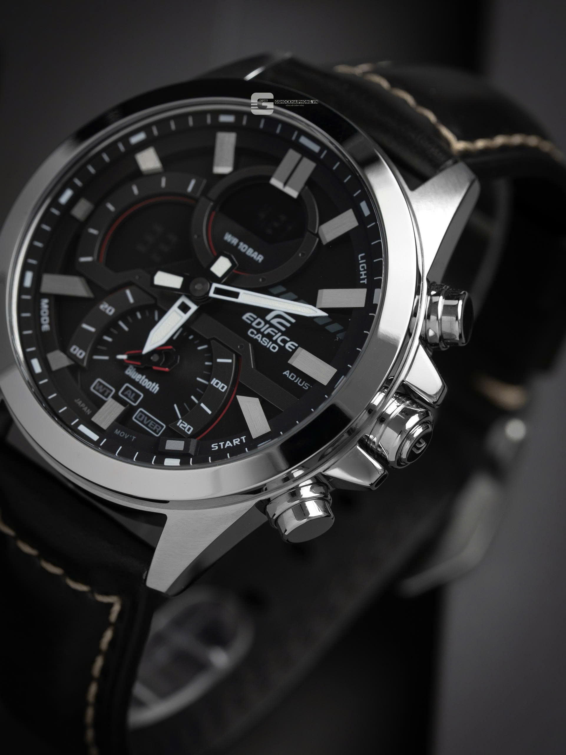 hào mừng bạn đến với cuộc cách mạng của Tốc độ & Trí tuệ được gói gọn trong chiếc đồng hồ EDIFICE kim loại, sở hữu thông số kỹ thuật và công nghệ cao, mang phong cách trang trọng và có khả năng kết nối dễ dàng với điện thoại thông minh. Với mẫu đồng hồ này, bạn chỉ cần nhấn để đồng bộ hóa với điện thoại thông minh qua Bluetooth® cũng như nhấn vào ứng dụng CASIO WATCHES để sở hữu đầy đủ chức năng trong tầm tay. Ứng dụng này đảm bảo hiển thị giờ hiện hành chính xác khi bạn ở gần điện thoại. Được phát triển nhằm đáp ứng nhu cầu của các đội đua, tính năng hẹn giờ có thể đồng bộ hóa với ứng dụng lịch trên điện thoại thông minh để truyền các mục lịch trình đến điện thoại cũng như hiển thị thời gian bắt đầu và kết thúc trên màn hình LCD của đồng hồ. Đồng hồ trang bị đèn LED phát sáng mỗi khi bạn nghiêng cổ tay. Thiết kế mặt cơ khí lấy cảm hứng từ những chiếc xe thể thao làm tăng chiều sâu và tính đa chiều nhằm tôn lên vẻ ngoài năng động, sức mạnh và độ cứng cáp của những chiếc xe hiệu suất cao này.