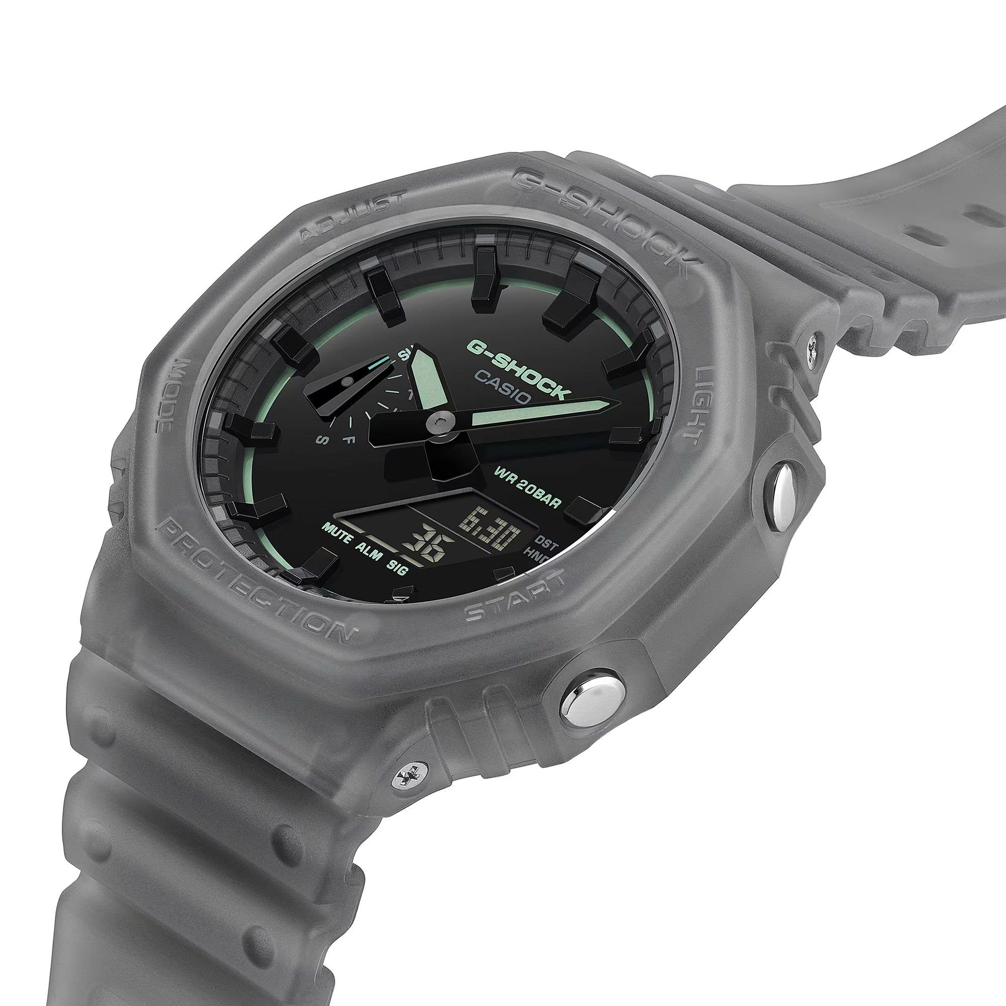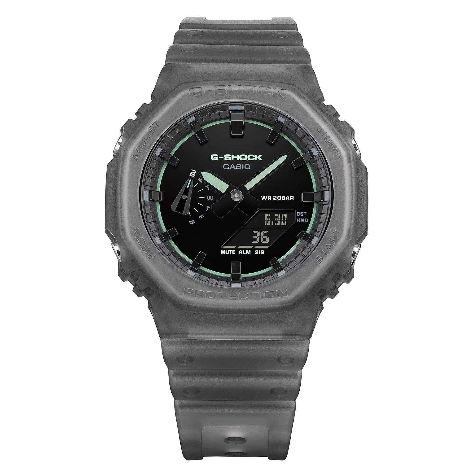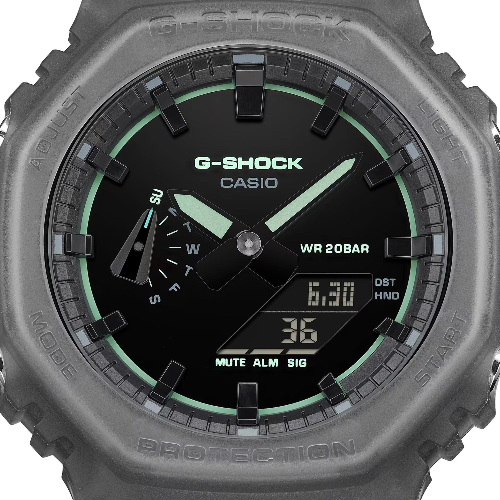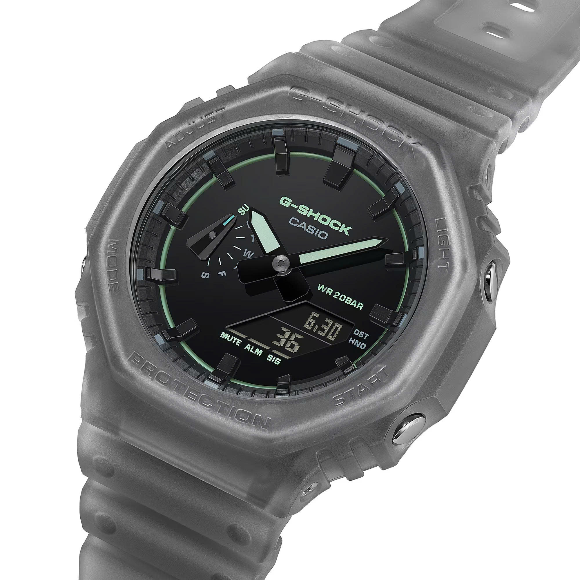 Đắm mình trong cảm giác ánh sáng huyền bí, mờ ảo với chiếc đồng hồ lấy cảm hứng từ cuộc sống về đêm sôi động với âm nhạc. Những chiếc đồng hồ mới này tái hiện lại sự hồi hộp đầy bí ẩn của các câu lạc bộ đêm và lễ hội âm nhạc, với ánh đèn laser xuyên suốt nhịp điệu âm nhạc lúc nửa đêm. Bề mặt hoàn thiện mới được phát triển mang lại vẻ ngoài tinh tế cho mặt số, hoàn toàn phù hợp với thiết kế tối giản của đồng hồ GA-2100. Bề mặt nhẵn mịn này là nền tảng lý tưởng cho lớp hoàn thiện bóng bẩy và bảng màu phong phú, làm nổi bật chiều sâu đáng kinh ngạc của màu đen piano. Các kết cấu và màu sắc khác nhau của các bộ phận đồng hồ gợi nhớ đến khung cảnh âm nhạc về đêm. Các điểm nhấn màu neon lấp lánh như ánh đèn laser, trong khi các vật liệu trong suốt với lớp hoàn thiện mờ được sử dụng để tạo cho gờ và dây đeo một kết cấu tuyệt vời, gợi nhớ đến làn khói mờ ảo trên sàn nhảy được máy tạo khói tạo ra. Một diện mạo và cảm giác hoàn toàn mới — thiết kế tiên tiến kết hợp với khả năng chống va đập của G-SHOCK.