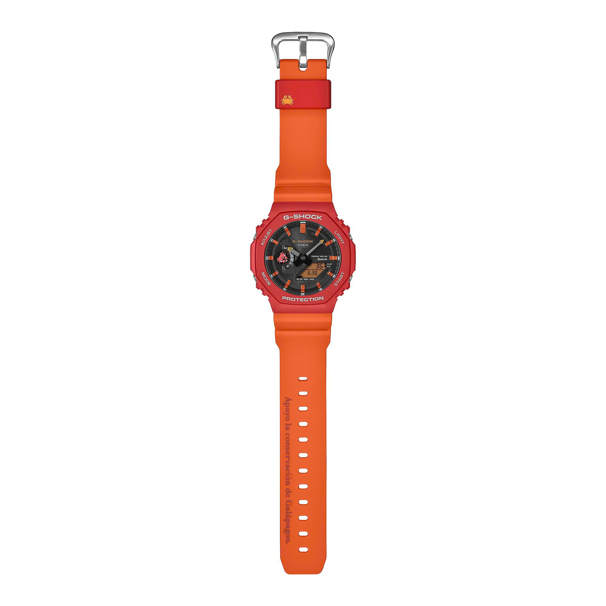 Hãy thể hiện tình yêu của bạn với quần đảo Galápagos bằng chiếc đồng hồ G-SHOCK hợp tác cùng Quỹ Charles Darwin — hai mẫu đồng hồ tuyệt vời lấy cảm hứng từ hai loài sinh vật biểu tượng sinh sống trên những hòn đảo tuyệt đẹp này. Lần hợp tác thứ ba của chúng tôi với Quỹ Charles Darwin, một tổ chức chuyên tham gia vào các hoạt động bảo tồn môi trường tại Quần đảo Galápagos, đã sản xuất hai chiếc đồng hồ hợp tác khác nhau: một chiếc lấy cảm hứng từ chim hải âu Galápagos và chiếc còn lại lấy cảm hứng từ cua Sally Lightfoot. Dựa trên mẫu GA-B2100 với tính năng Kết nối điện thoại thông minh và sạc Tough Solar, cùng dây đeo và gờ đồng hồ làm bằng nhựa sinh học được sản xuất từ các nguồn tài nguyên hữu cơ tái tạo, những chiếc đồng hồ này tôn vinh những sinh vật đáng yêu này với các chức năng và vật liệu thân thiện với môi trường, màu sắc sống động và thiết kế độc đáo. GA-B2100DF-1A lấy cảm hứng từ chim hải âu Galápagos, một trong những loài chim lớn nhất trên đảo, với sải cánh hơn hai mét. Hình ảnh lướt nhẹ nhàng của chim hải âu trên những luồng gió đang dâng lên được khắc họa qua kim chỉ giờ và vòng dây đeo. Mặt số được trang trí bằng một bản đồ Galápagos, điểm xuyết bằng các chi tiết màu vàng gợi lên hình ảnh mỏ chim. Vỏ sau được khắc logo và tên Quỹ Charles Darwin bằng tiếng Tây Ban Nha và trên dây đeo có in dòng chữ “Apoyo la conservación de Galápagos.” (Tiếng Tây Ban Nha có nghĩa là "Tôi ủng hộ việc bảo tồn Galápagos"). Những chiếc đồng hồ này cũng đi kèm với bao bì đặc biệt, không chứa nhựa, xứng đáng là một sản phẩm hợp tác đồng hồ với Quỹ Charles Darwin.