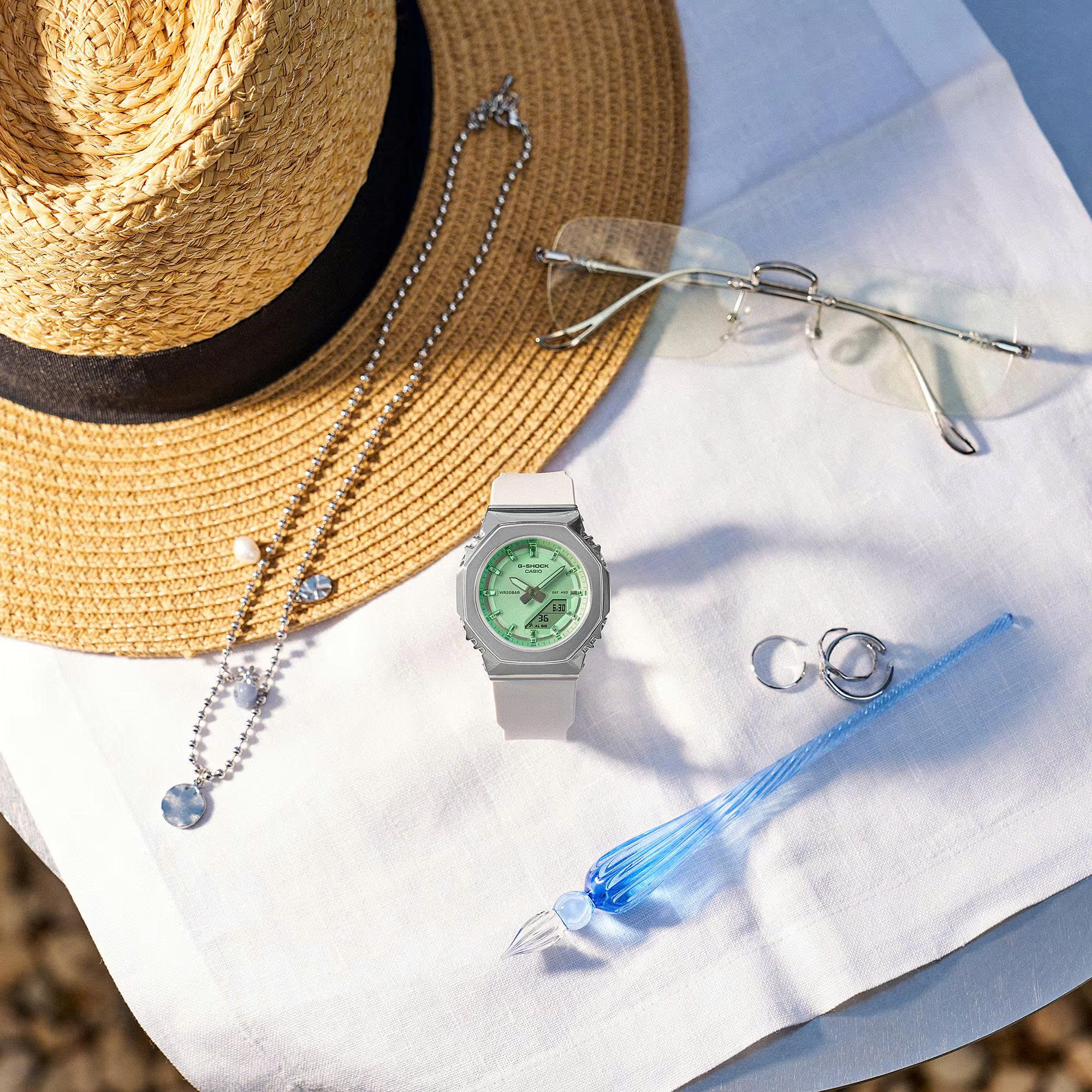 Được xử lý bằng phương pháp lắng đọng hơi phân cực, mặt kính đồng hồ mang đến cảm giác mùa hè ngập tràn ánh nắng với màu sắc thay đổi theo chuyển động cổ tay. Gờ kim loại sang trọng và những biến tấu màu sắc tinh tế kết hợp tạo nên vẻ đẹp sang trọng, hiện đại cho một thiết kế gợi lên cảm giác nhẹ nhàng, thư thái của một khu nghỉ dưỡng mùa hè.