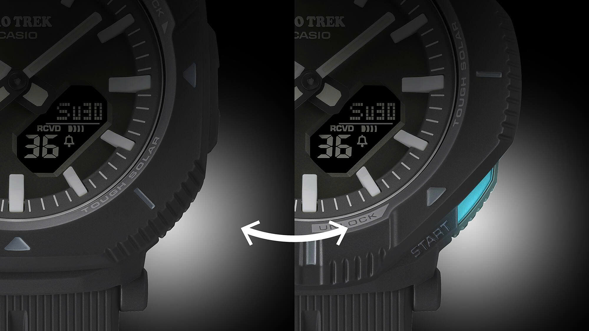 PRJ-B001 nâng tầm thiết bị lên một tầm cao mới với gờ bảo vệ xoay đầu tiên trong dòng PRO TREK. Xoay gờ xoay để chuyển đổi giữa hai phong cách riêng biệt. Khi được đặt để thể hiện một thiết kế góc cạnh đầy phong cách, bổ sung cho phong cách thời trang hàng ngày, gờ bao phủ các nút, ngăn ngừa việc vô tình nhấn nút khi đi bộ ra ngoài hoặc trong thị trấn. Xoay gờ 45 độ để đồng hồ trông tròn hơn và mở các nút để dễ dàng truy cập chức năng khi đi bộ đường dài hoặc tập luyện.