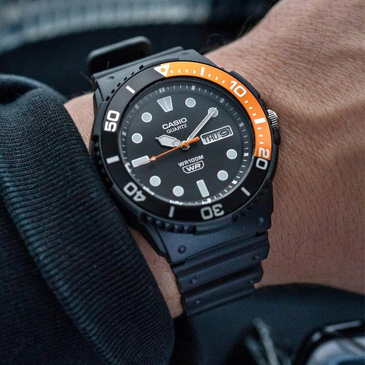 Sự kết hợp táo bạo giữa màu cam và đen trên gờ cùng với mặt số đen và kim giây màu cam tạo điểm nhấn nổi bật trên cổ tay. Thiết kế tương phản cao này tăng cường khả năng hiển thị, đảm bảo dễ dàng đọc giờ chỉ bằng một cái nhìn thoáng qua.