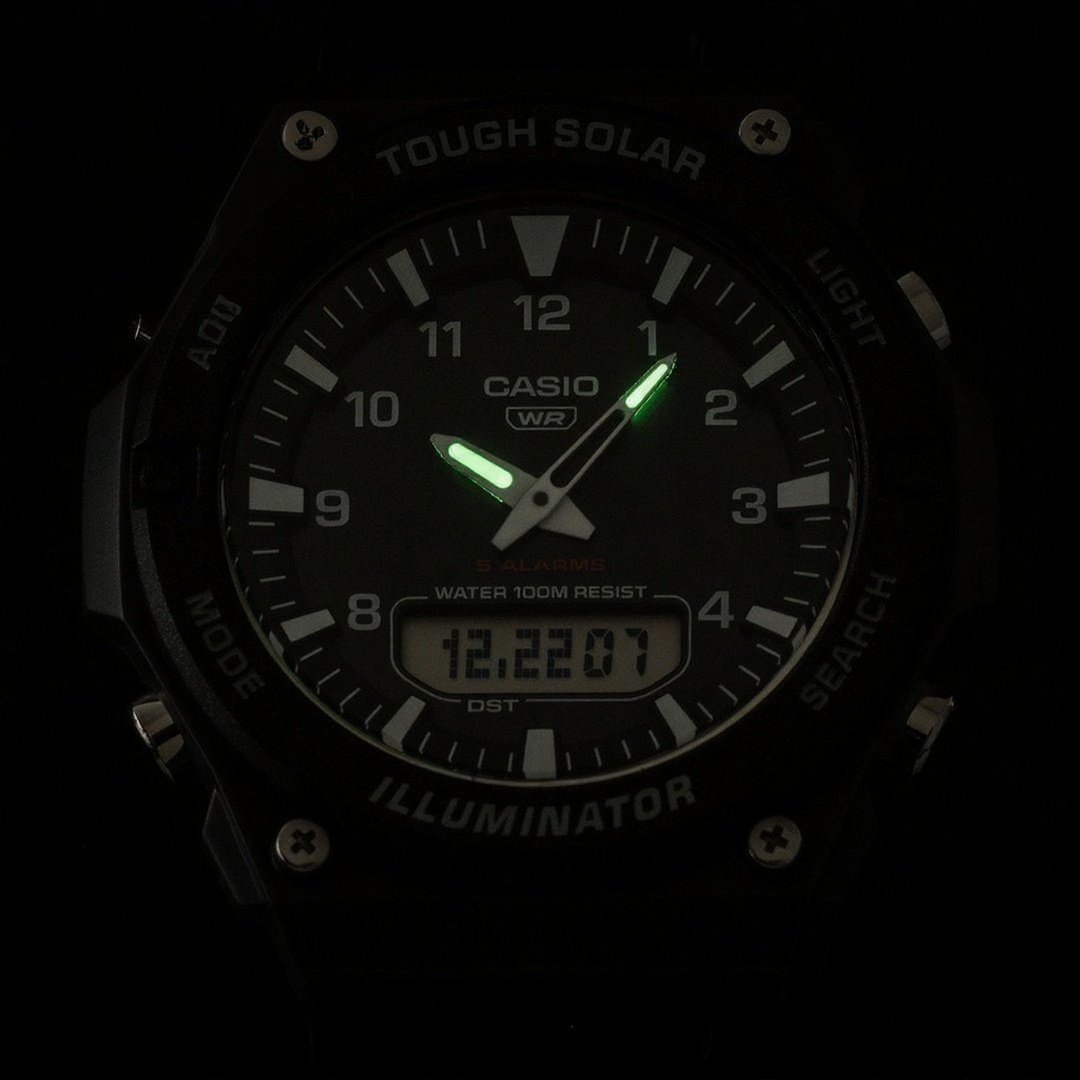- Điểm "ăn tiền" nhất của AQ-S820W chính là hệ thống năng lượng Tough Solar. Thay vì sử dụng pin oxit bạc thông thường phải thay thế sau 1-2 năm, chiếc đồng hồ này sở hữu một tấm pin năng lượng mặt trời ẩn dưới mặt số.