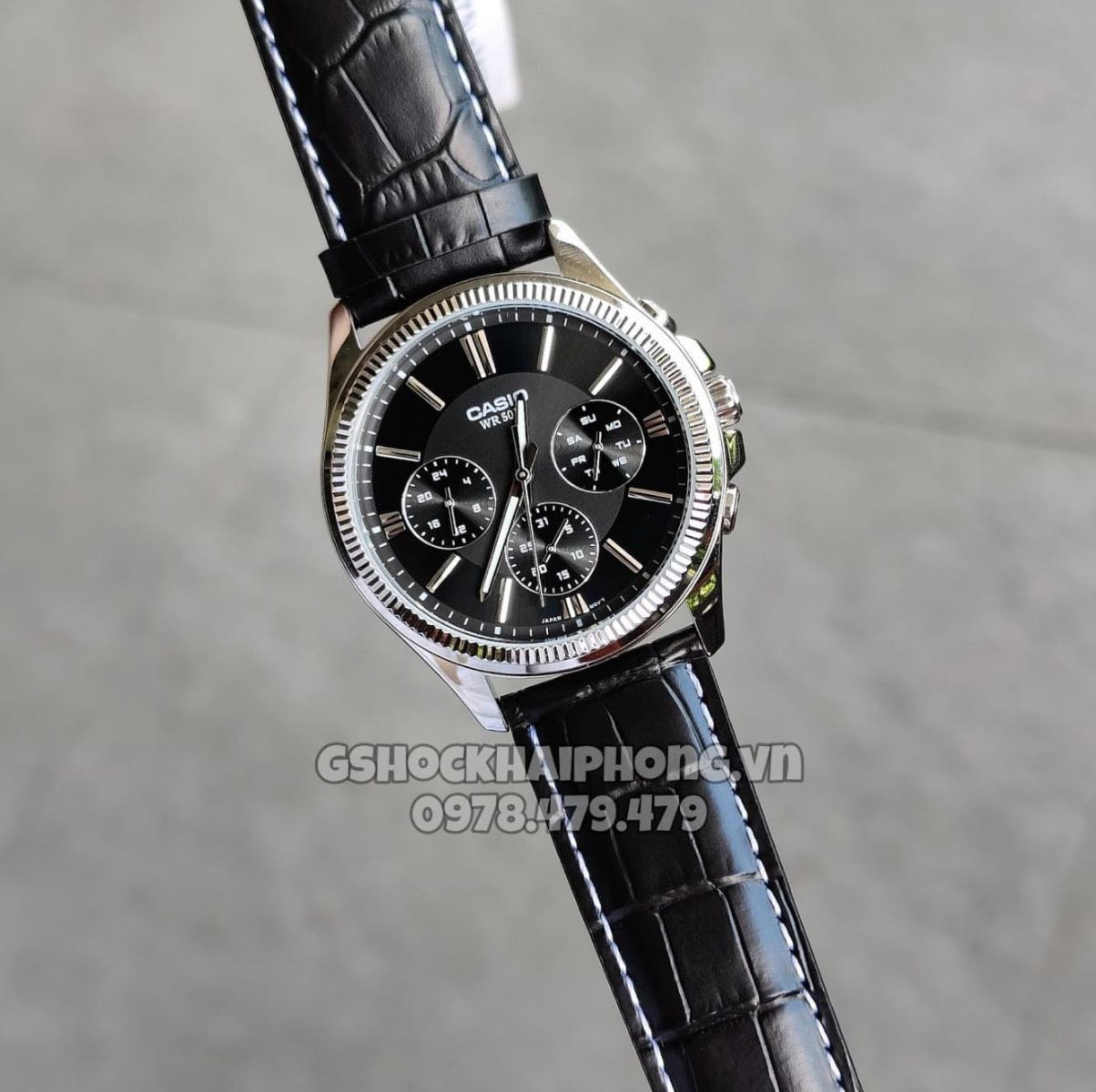 • MTP-1375D-1A: Mặt đen huyền bí, dây kim loại bạc – Lựa chọn nam tính nhất.