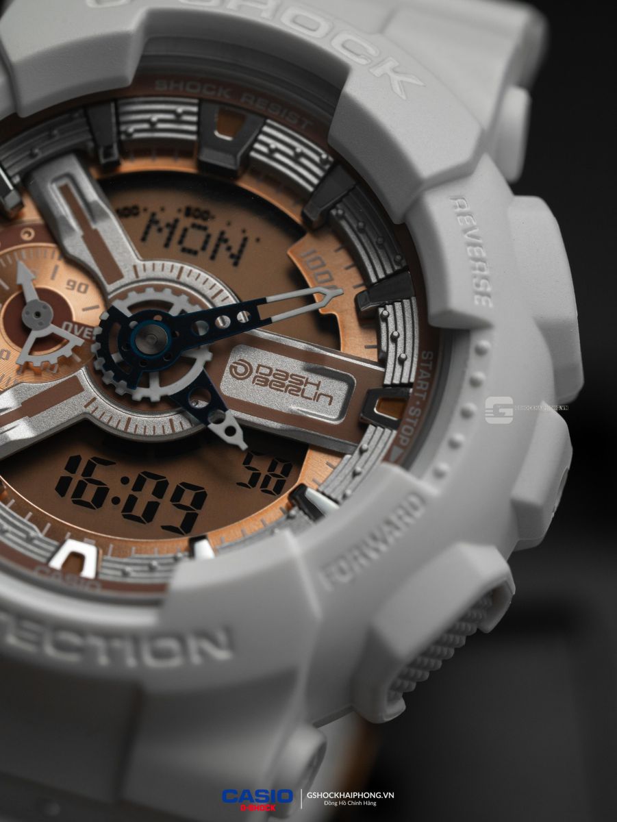 - Dựa trên nguyên mẫu là dòng GA-110 huyền thoại – dòng đồng hồ có mặt số lớn (Big Case) bán chạy nhất mọi thời đại của G-Shock – phiên bản Dash Berlin mang đến những tùy chỉnh độc bản: