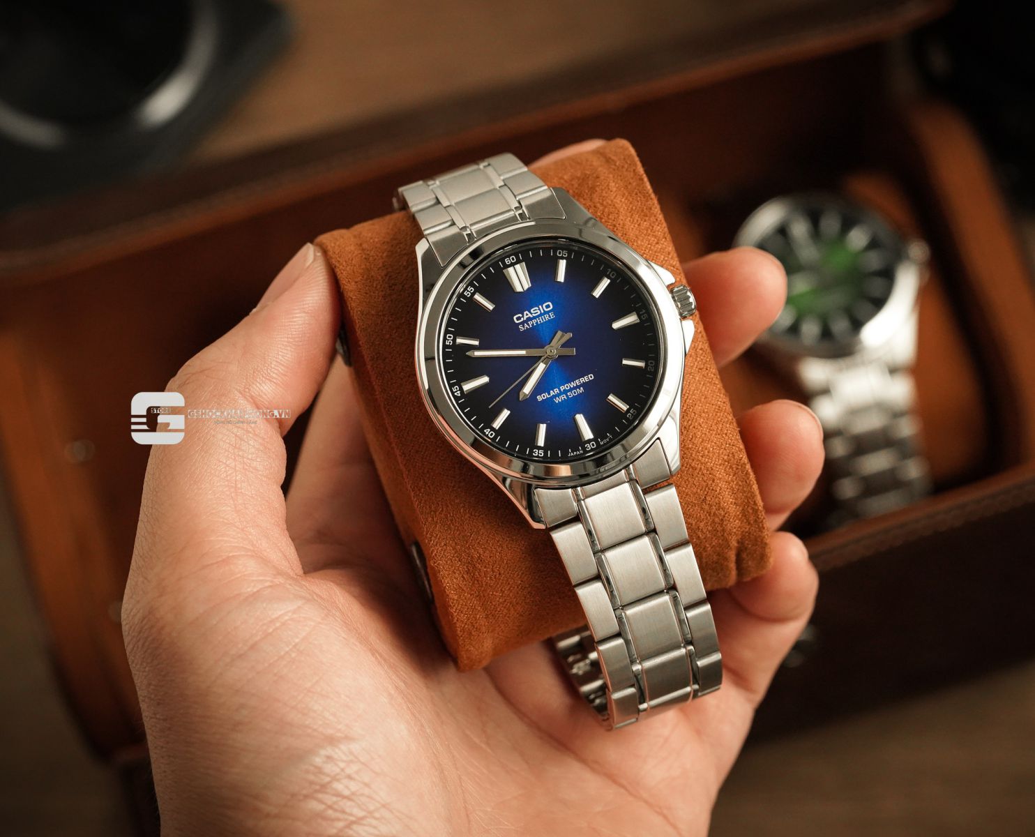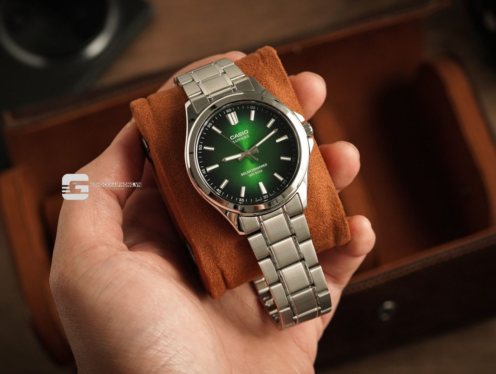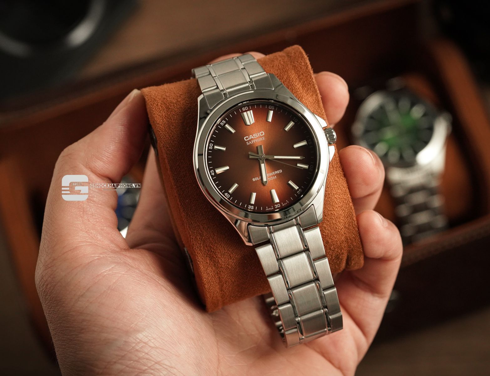 Điểm cộng của Casio MTS-RS100 chính là mặt kính sapphire – loại kính cao cấp có khả năng chống xước vượt trội so với kính khoáng thông thường. Nhờ đó, đồng hồ luôn giữ được vẻ ngoài sáng bóng, ít bị ảnh hưởng bởi va chạm trong quá trình sử dụng hằng ngày.